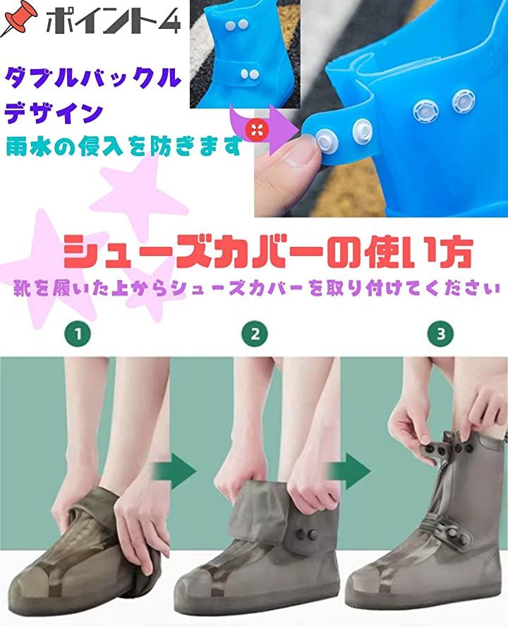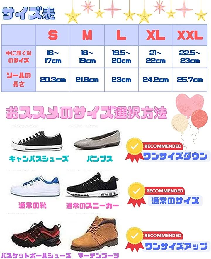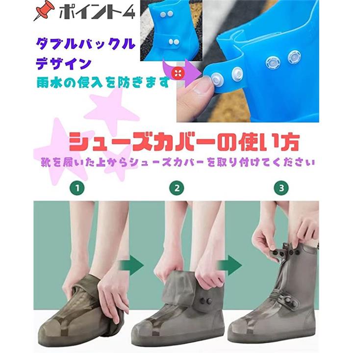 ・「サイズ明細」S(16~17cm)、M(18cm-19cm)、L(19.5-20cm)、XL(21~22cm)、XXL(22.5~23cm) 素材:PVC ご注意:靴の種類によって適応サイズが異なる場合がございますので、お手持ちの靴サイズをご確認の上、お買い求めください。