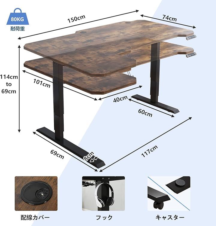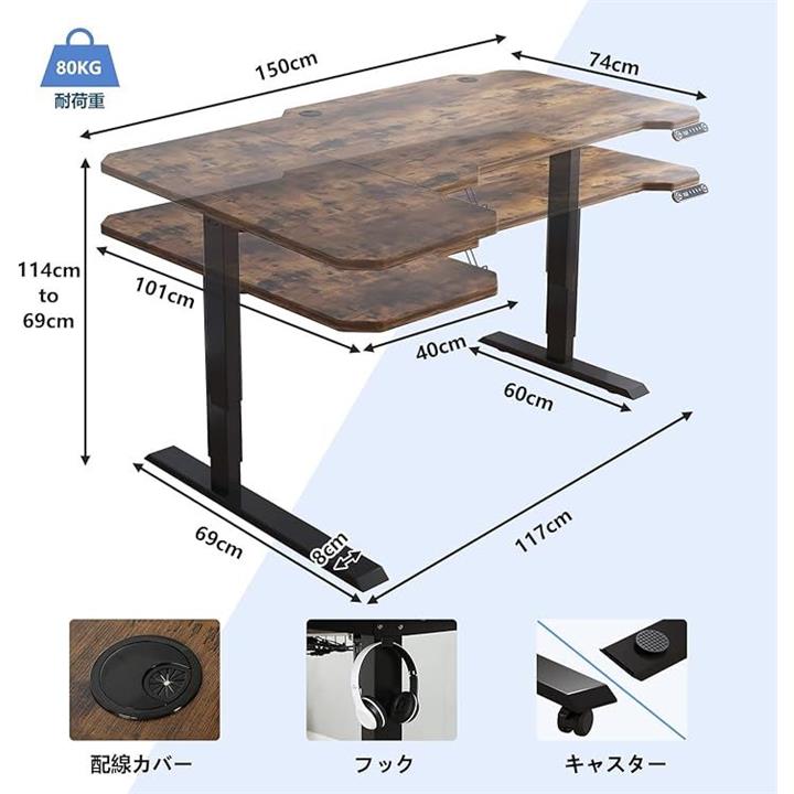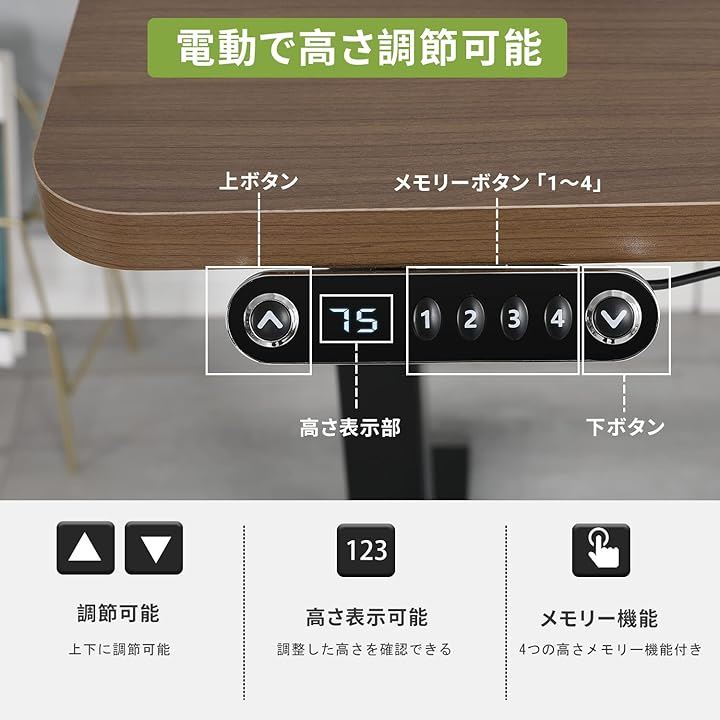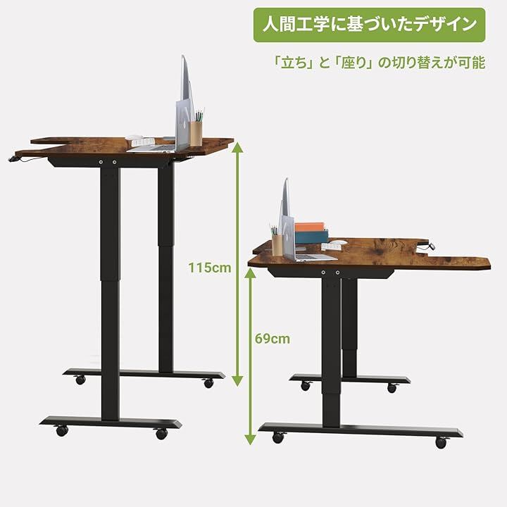 電動昇降デスク 机 電動式 パソコンデスク 電動昇降式スタンディングデスクつくえ 高さ調節メモリー機能付き 高さ69~115CM 高さ調節可能