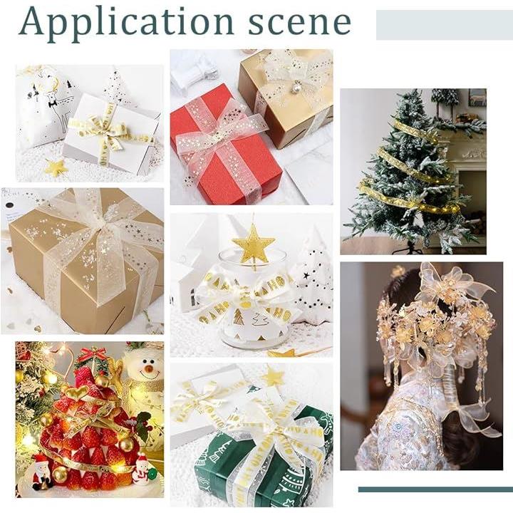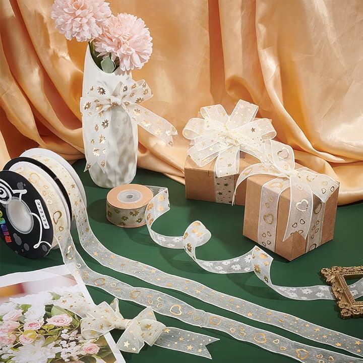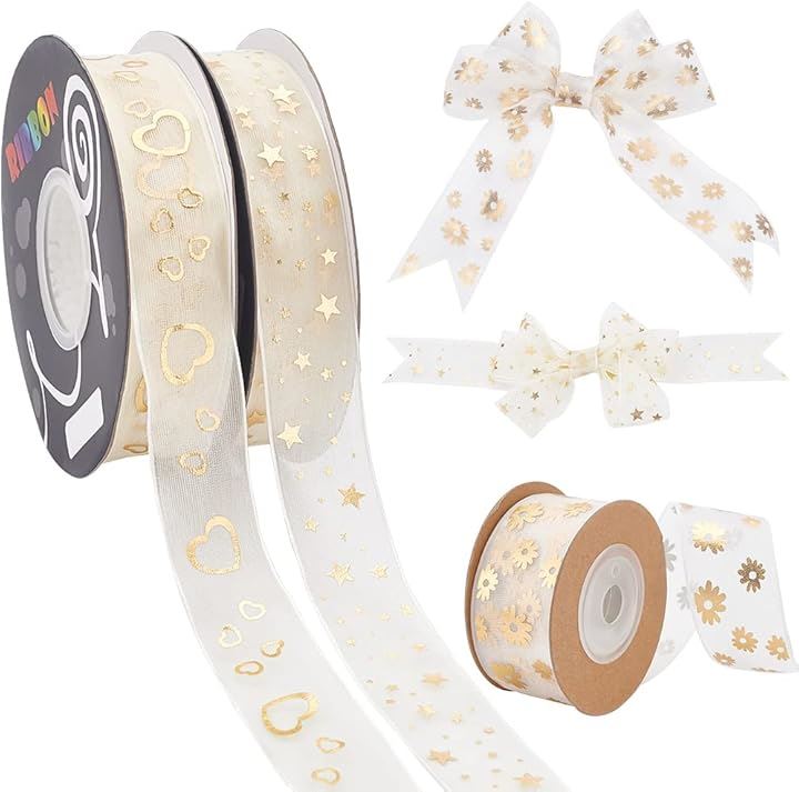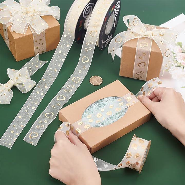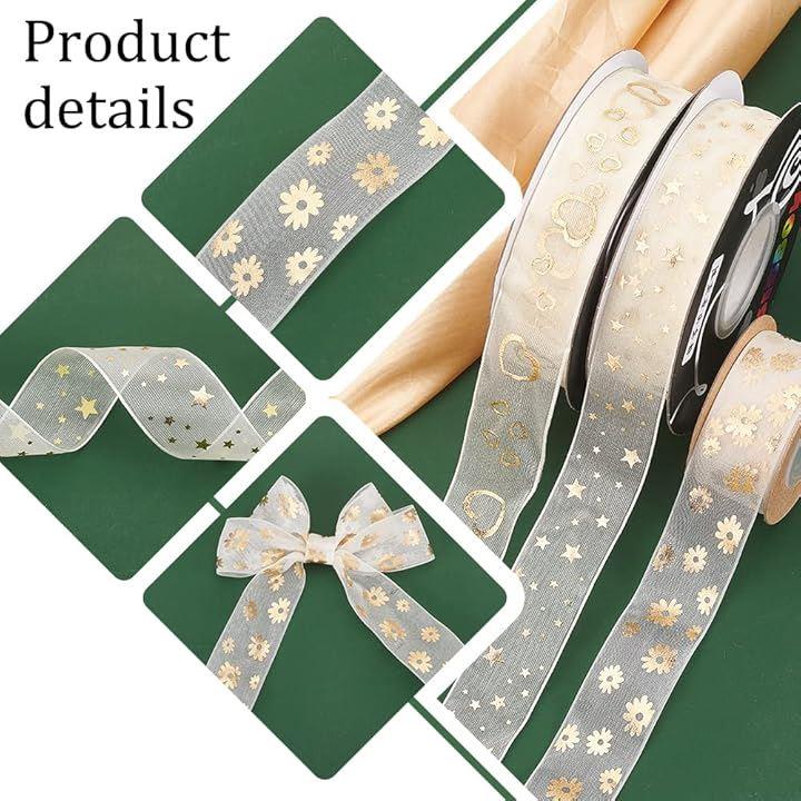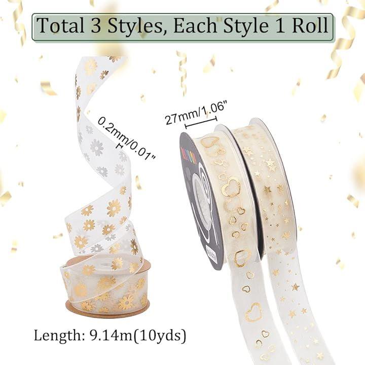 互換品PandaHall 3巻入り オーガンジーリボン ラッピング 透け感 27mm幅 フラワー ハート スター柄 結婚式のブーケ ギフト包装用 飾り付け ウェディング飾り ハンドメイド 手作りリボン DIY 手芸用品 9.14m/巻