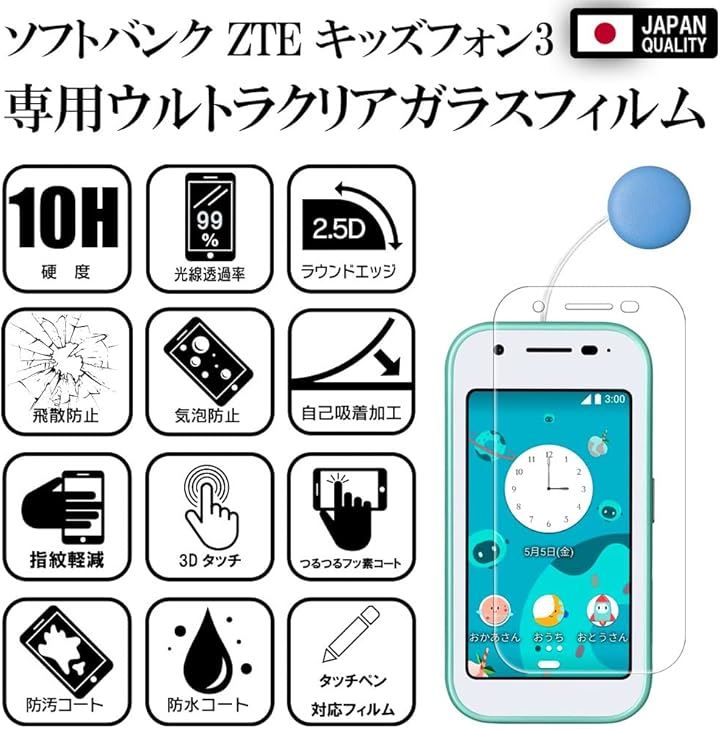 2023年最新強化モデル フィルム ソフトバンク ZTE キッズフォン3 対応 ガラスフィルム 保護フィルム 高透過 高光沢 日本製 旭硝子 硬度10H