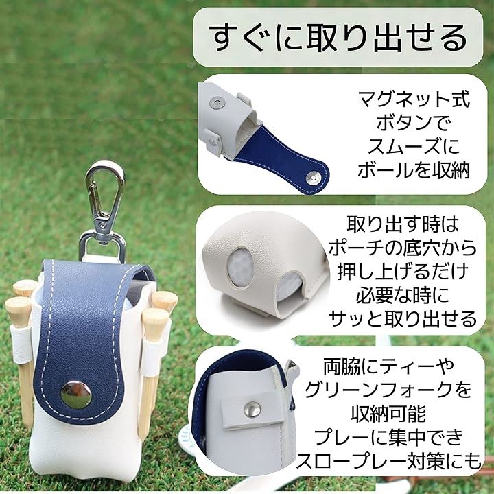 ゴルフボールケース ポーチ ボール入れ ボール2個入用 小物入れ マグネット 青/白 4x5x10cm