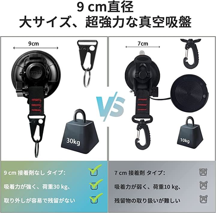 「大型直径9cm吸盤、耐荷重30kgの高い吸着力」高品質のABSとPVC素材で作られた吸盤は耐摩耗性、耐久性に優れています。
