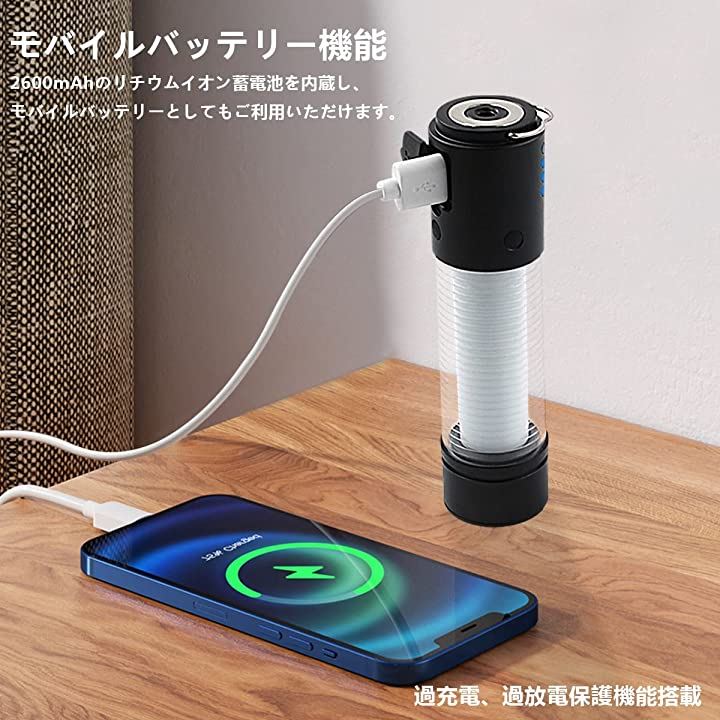 ランタンは2600mAhの容量リチウムイオン蓄電池を内蔵し、出力USBポートを搭載しており、緊急時には携帯電話やUSB給電設備の緊急モバイル電源として使用することができます。