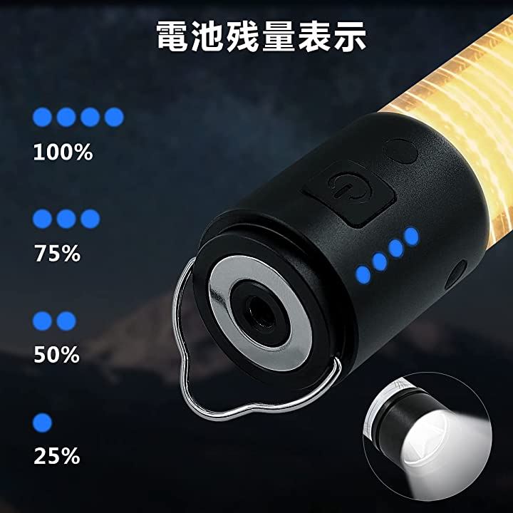 1回押すと点灯し、6つの照明モード(懐中電灯>ランタン暖色高輝度 > ランタン暖色中輝度 >ランタン暖色低輝度 > 赤色 > 赤色点滅SOS>off)素早く消灯機能を特別に追加しました 。