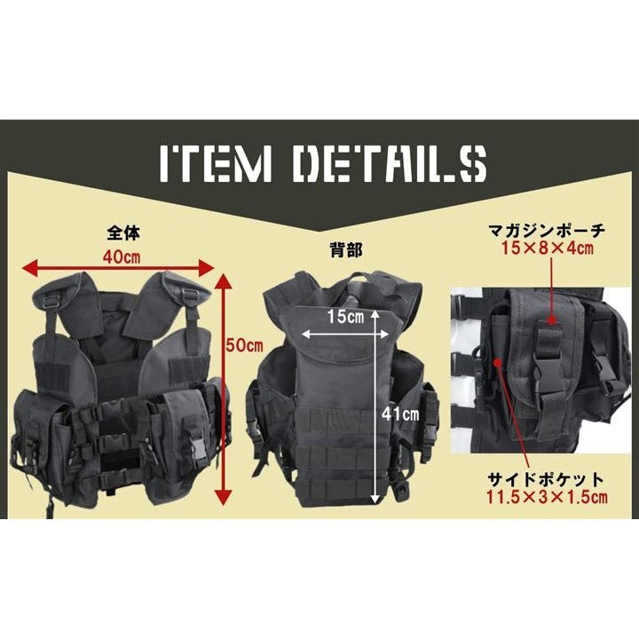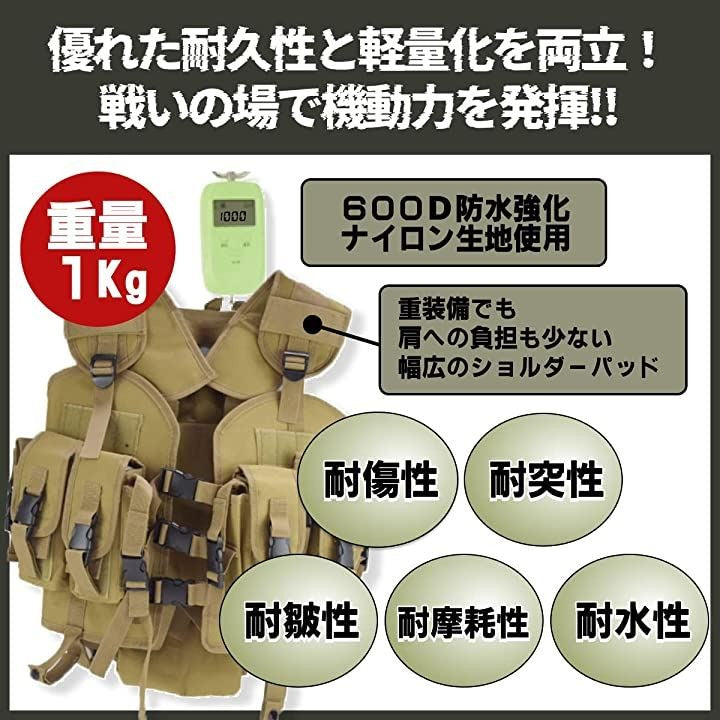 耐傷性、耐突性、耐皺性、耐摩耗性、耐水性に優れたタクティカルトサバゲーベストとなっています。