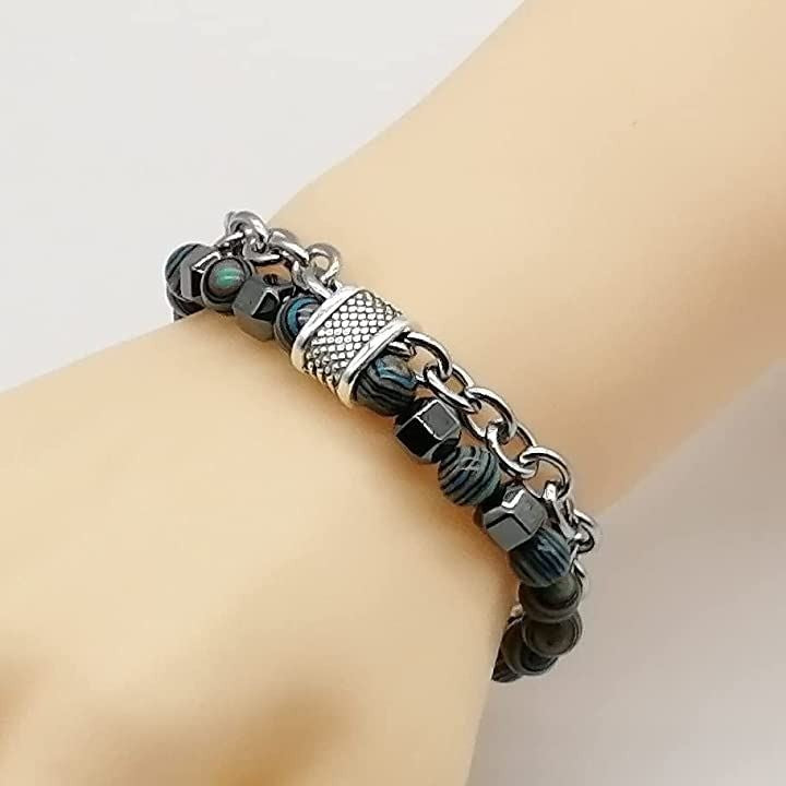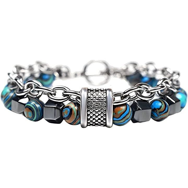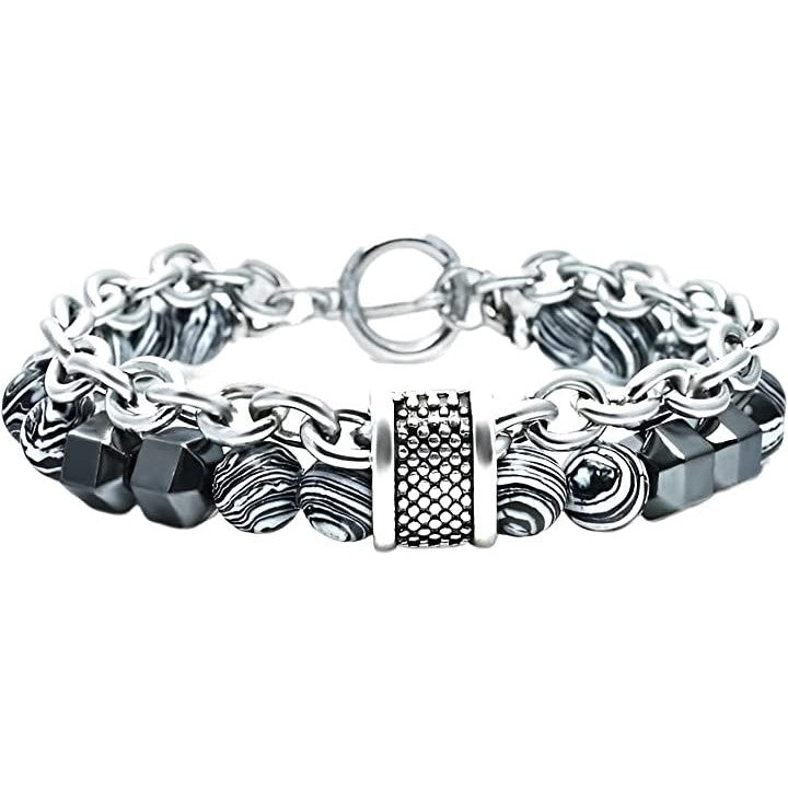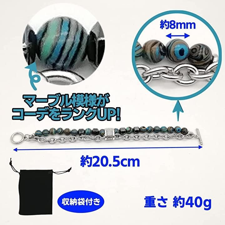 ブレスレット メンズ チェーン バングル 数珠 2連 異素材 ストーン マーブル模様 収納袋付き
