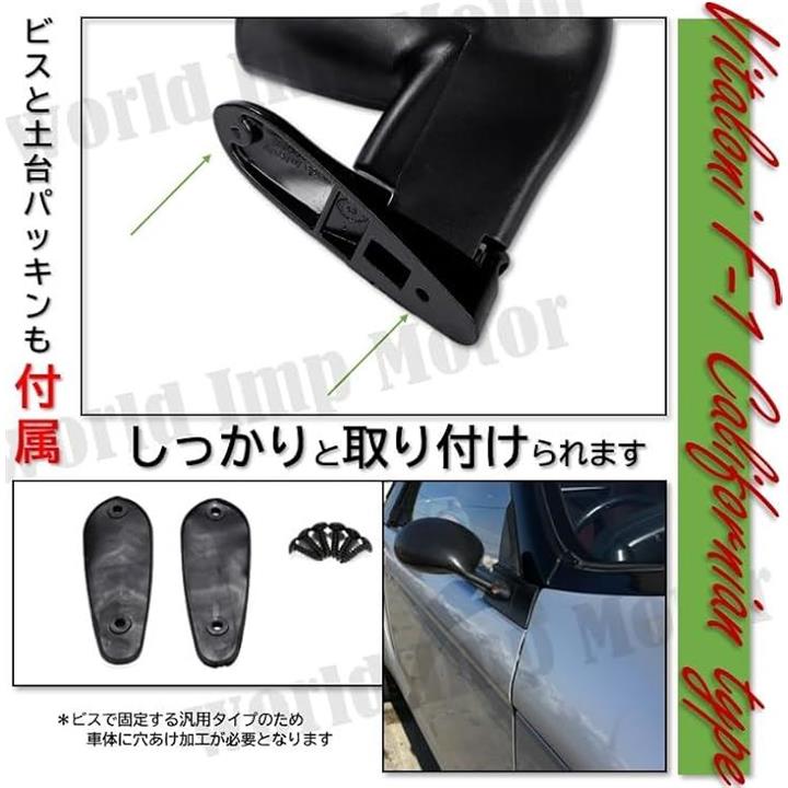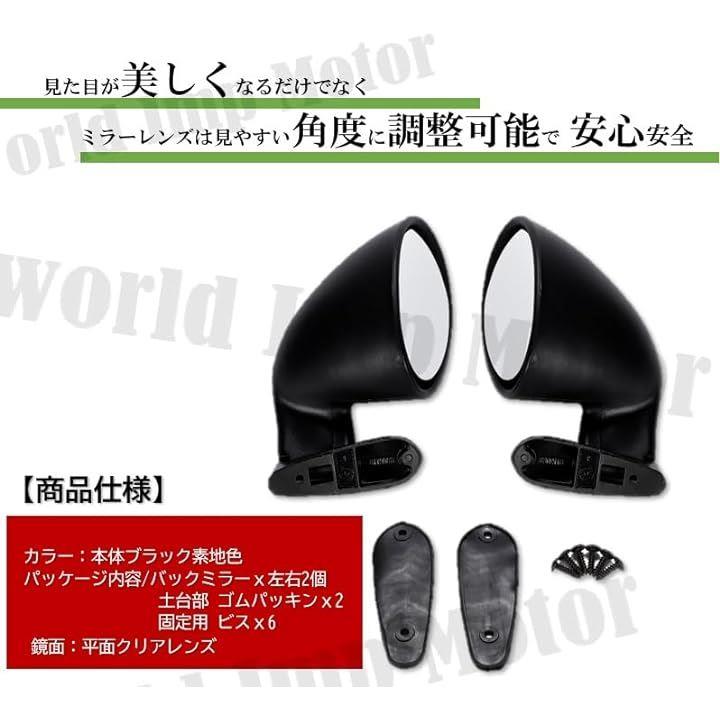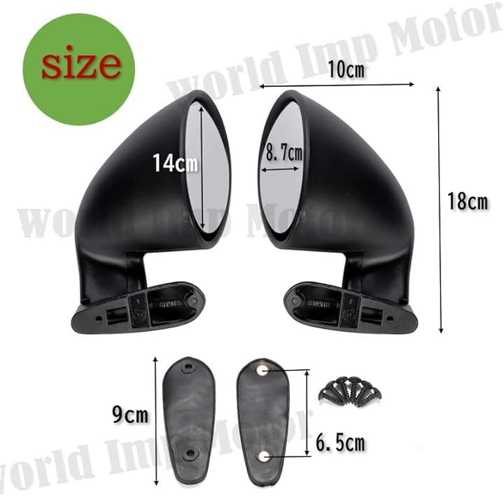 「商品仕様」 ・カラー:本体 ブラック 素地色 ・パッケージ内容:バックミラーx左右2個 土台部 ゴムパッキンx2 固定用 ビスx8 ・サイズ:本体:185 x 100 x 115mm / ミラー:142 x 87mm ・鏡面:ノーマルレンズ