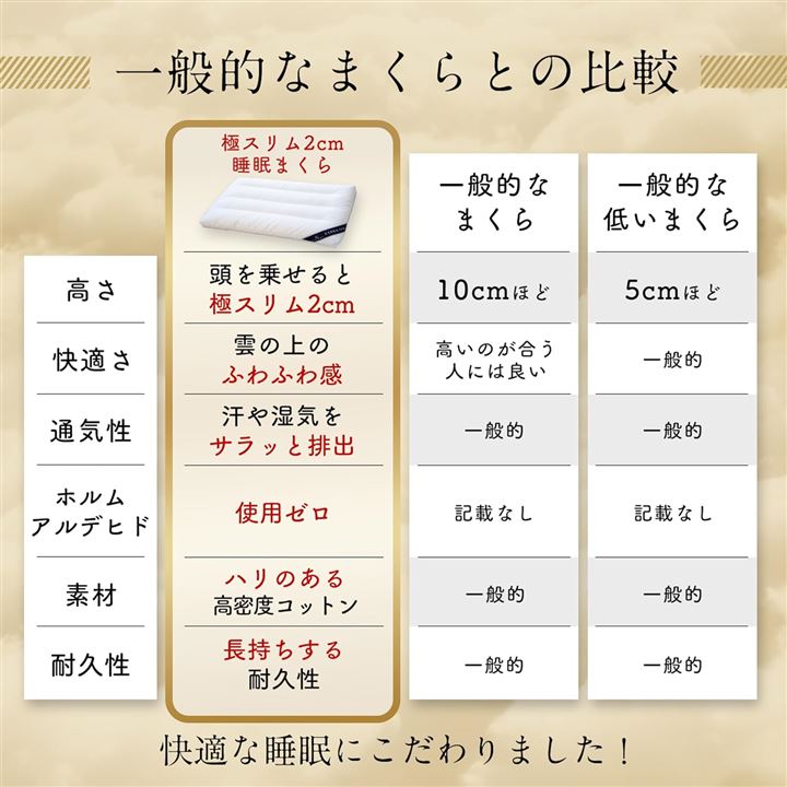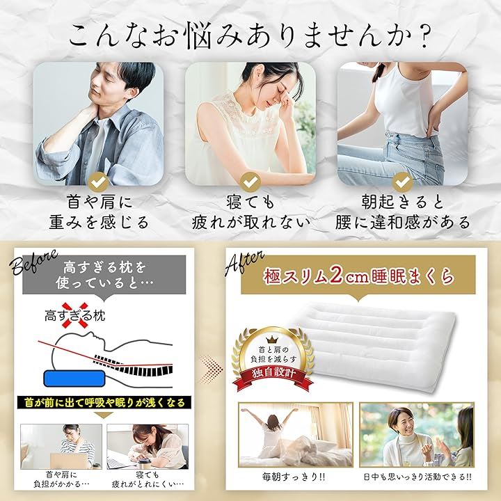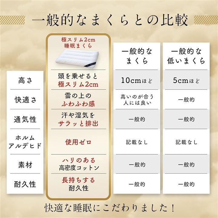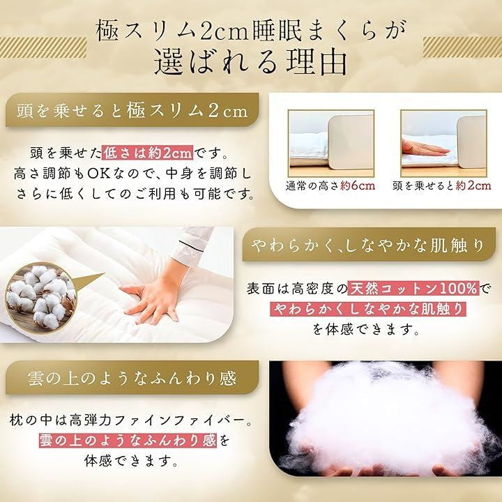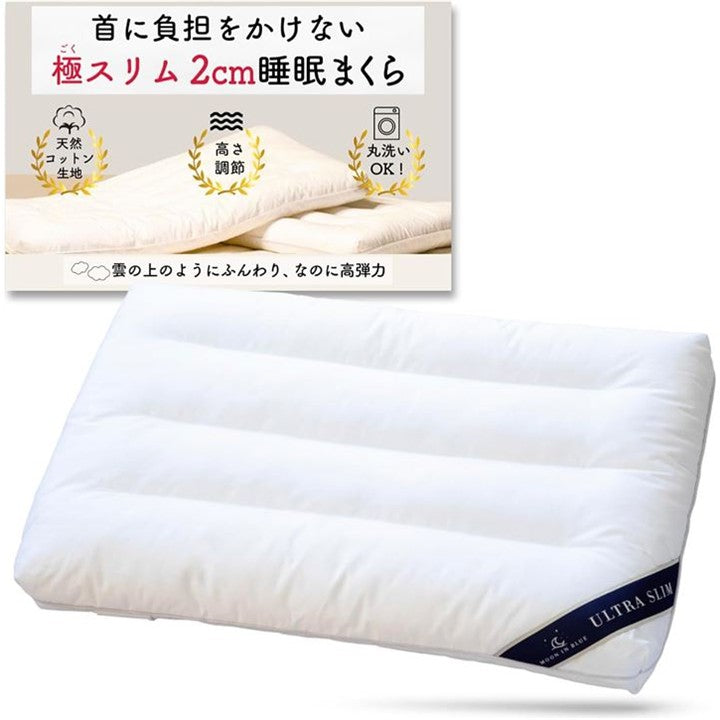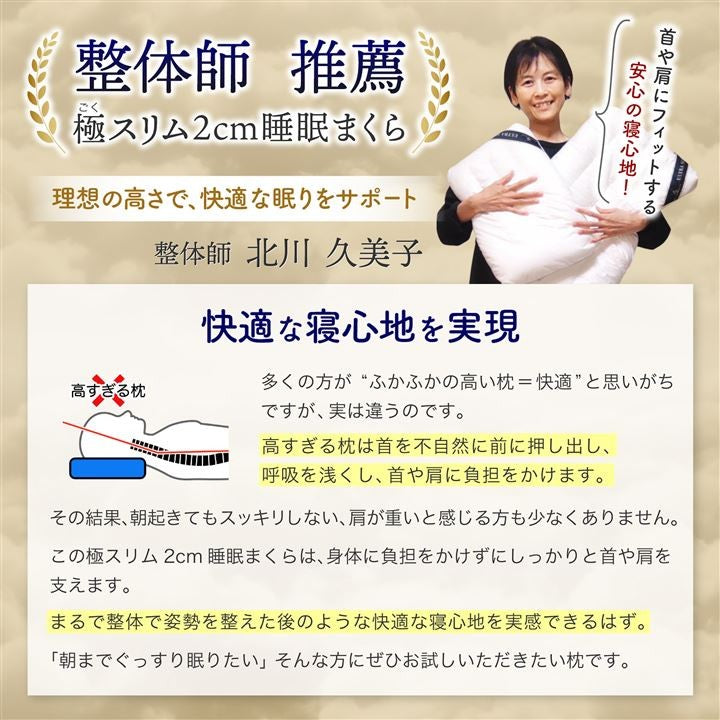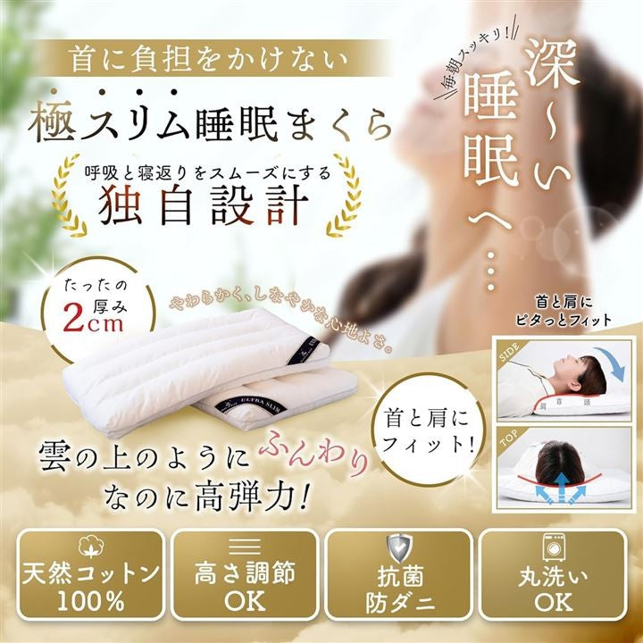 極スリム2cm 睡眠まくら ”低さ”と”寝心地”を追求 首や肩の負担を減らす 枕 低め 低い枕 薄い枕 マクラ 睡眠枕 肩こり 首こり ストレートネック ピロー 柔らかい枕 通気性 高さ調整 洗える 天然コットン 40x60cm