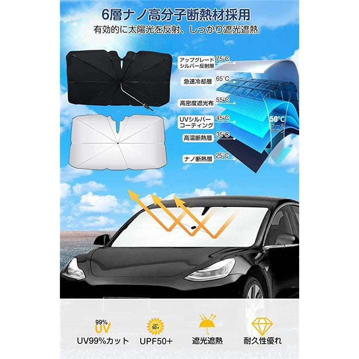 「6層ナノ高分子断熱材料・内装劣化防止」傘面は6層ナノ高分子断熱材料を採用し、外側はチタンシルバーコーティングされ、99%以上の有害な紫外線を効果的に遮断し、強い日差しを反射して車内温度の上昇を抑え、エアコンへの負荷が減り、省燃費も向上させます。