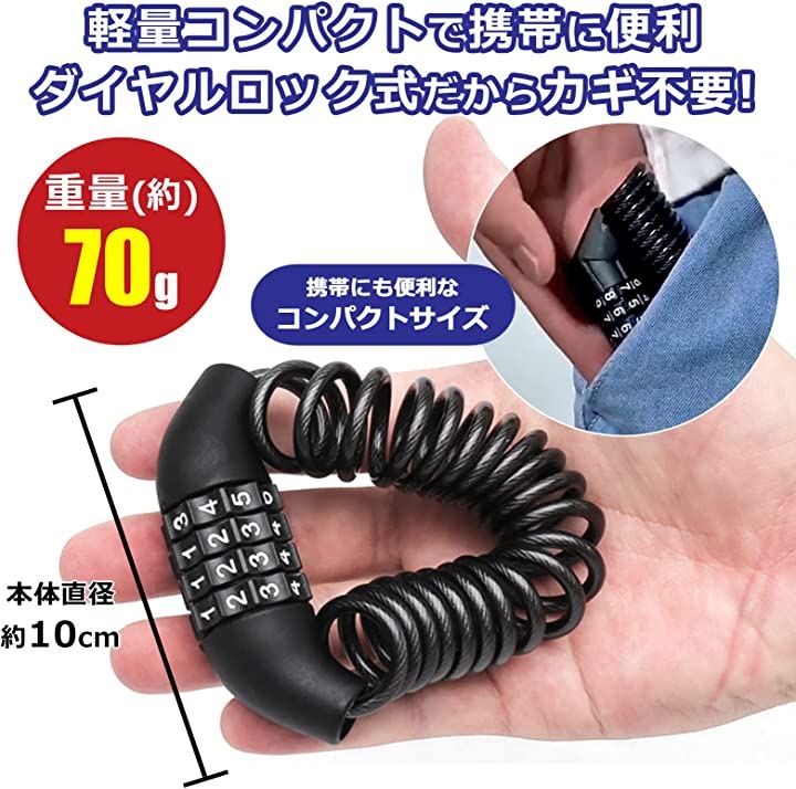・「軽量&ポータブル」:ケーブルサイクルロックは、セルフコイリングで使いやすく、収納も簡単で、80gと軽量なので、スペースもとらなく、軽装で荷物を少なり、軽量で常時持ち運びやすいです。