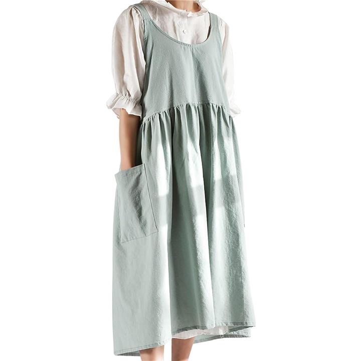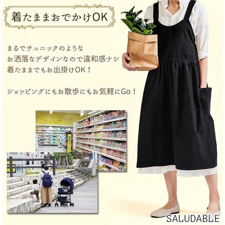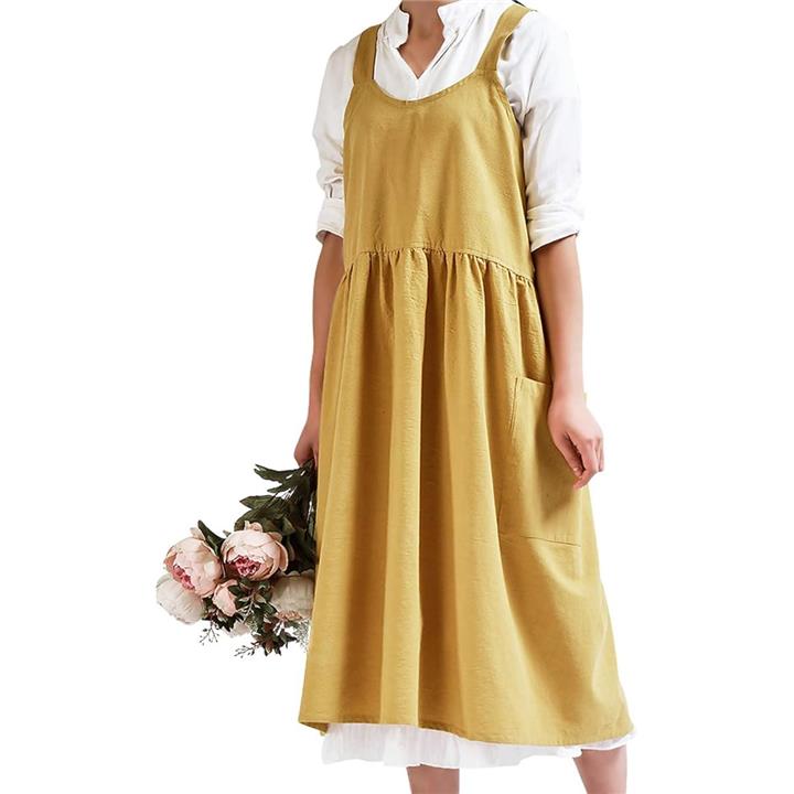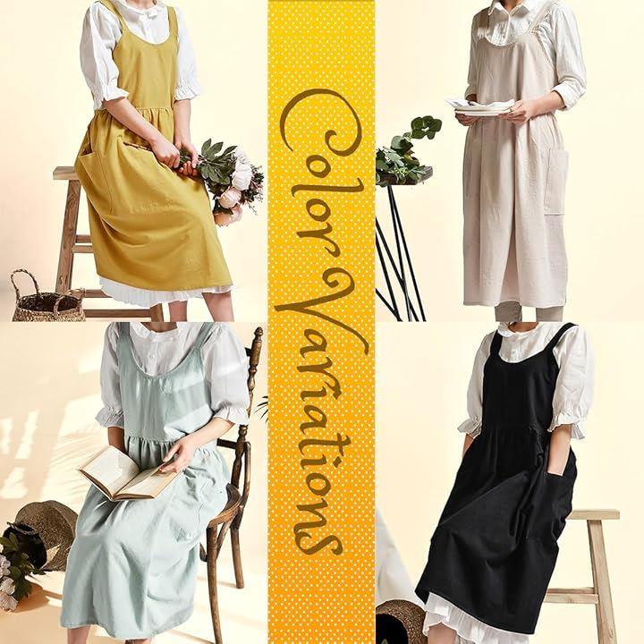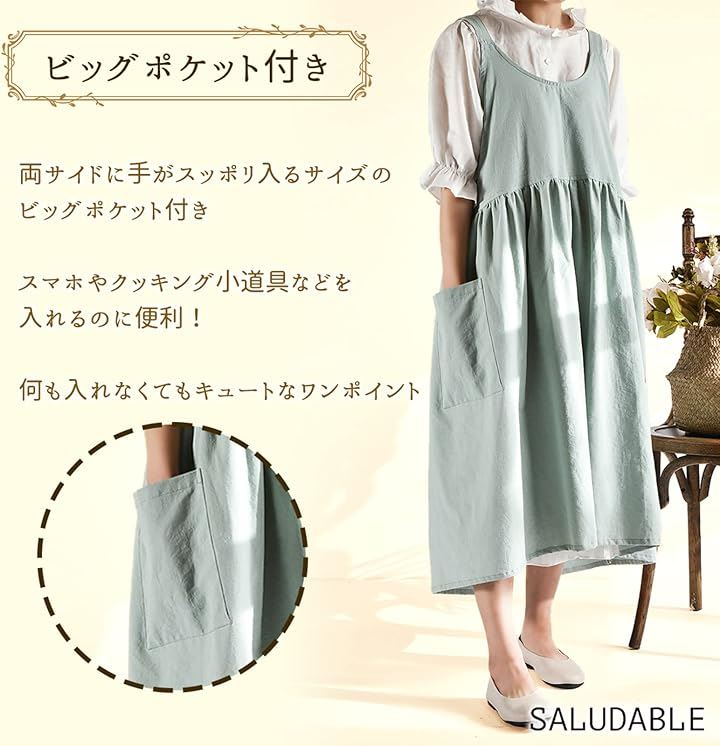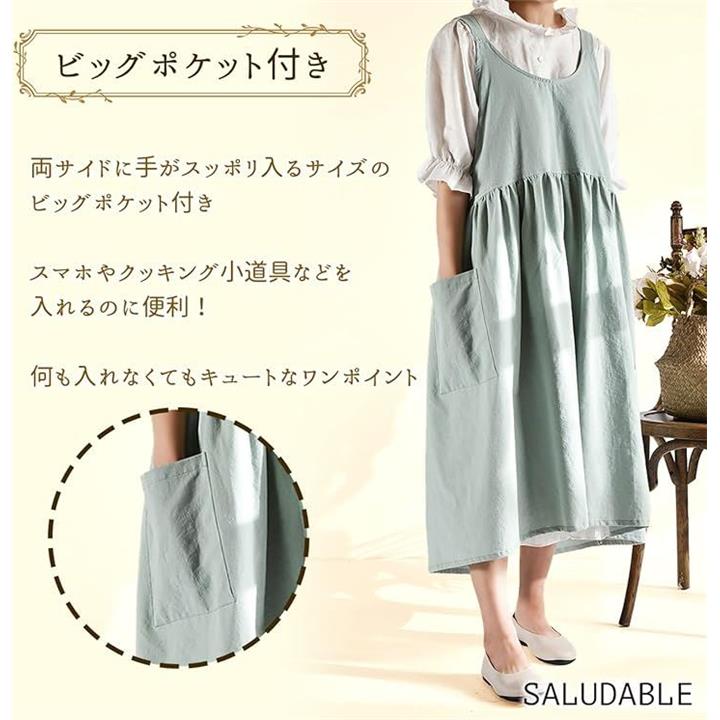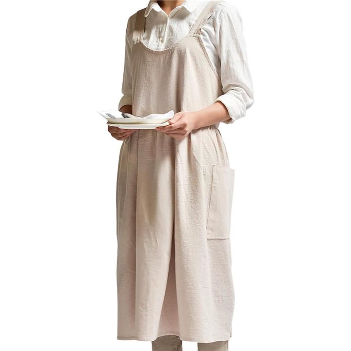 北欧風エプロン おしゃれでかわいい ワンピース H型 シンプル 保育士 ドレス コットン ナチュラル ロング丈 ポケット付き