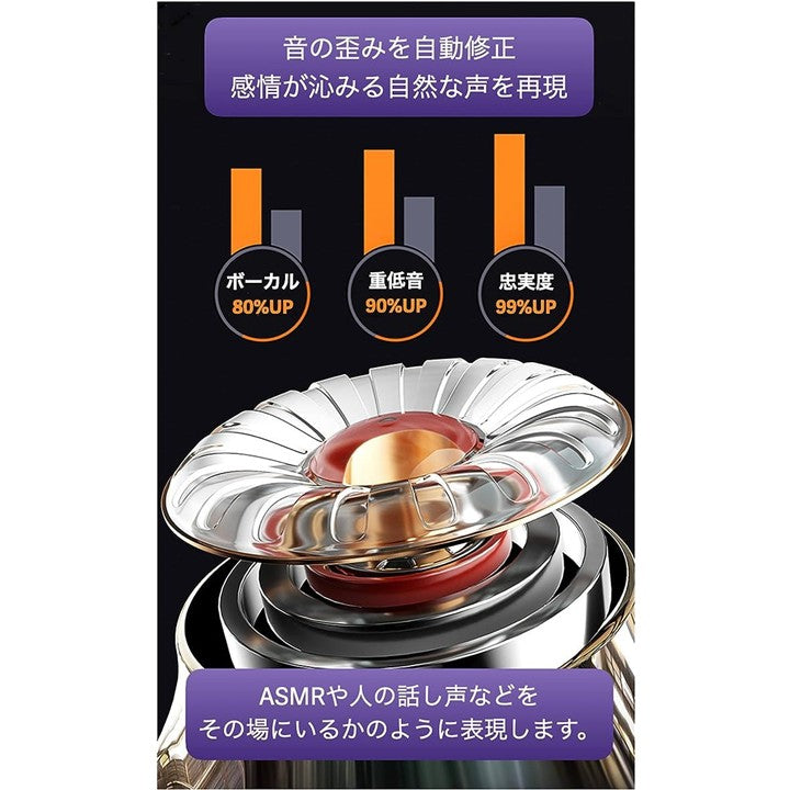 ヘッドホン技術を応用した豊かな音質ヘッドホン技術を応用することで、従来のイヤホンより「ボーカルの聴きやすさ80%UP」「重低音の響き90%UP」「原音への忠実度99%UP」を実現しました。