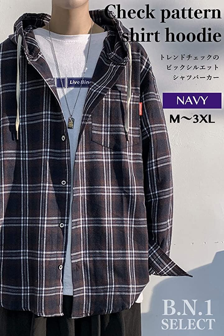 [ビーエヌワン セレクト] チェック パターン シャツ パーカー ビックシルエット ストリート カジュアル 長袖 トップス ジャケット ネルシャツ 上着 羽織 フーディー フード アウター オシャレ アメカジ かっこいい かわいい ゆったり 紳士 男性 春 秋 冬 秋冬 服 大人 ファッション 20代 30代 大きいサイズ 韓国 オーバーサイズ 紺 ネイビー BN73 NVY M |