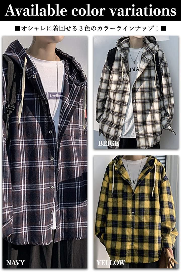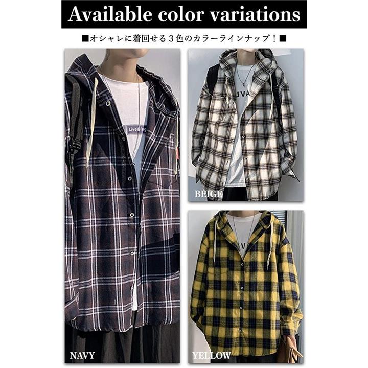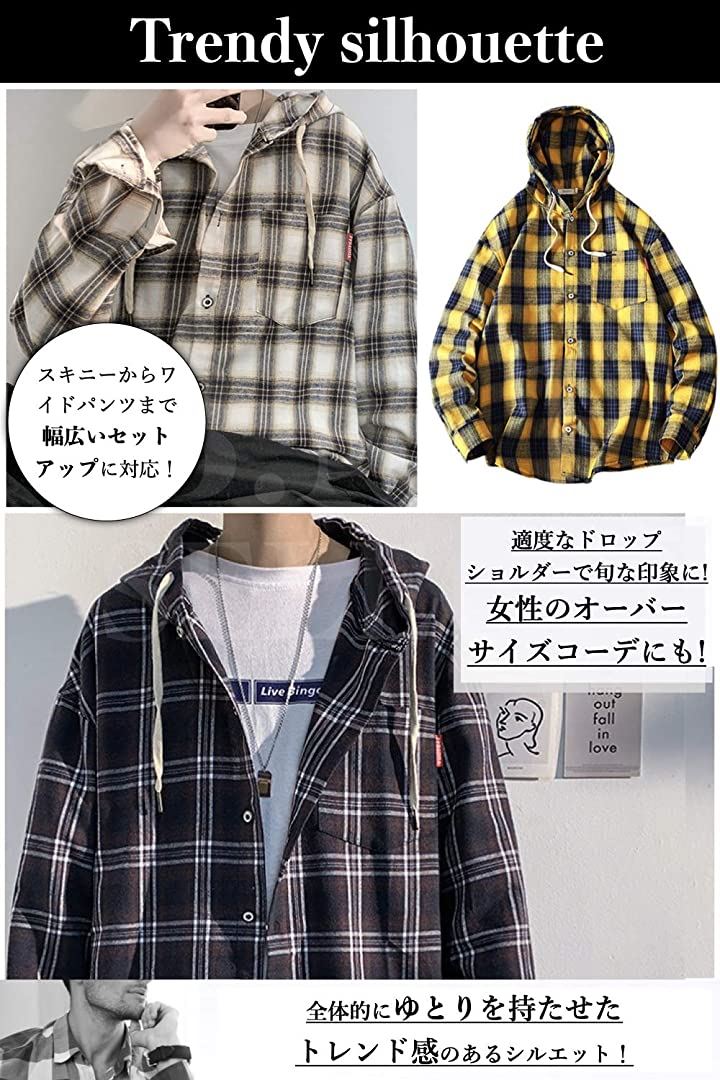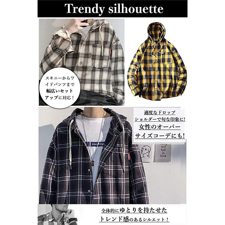 [ビーエヌワン セレクト] チェック パターン シャツパーカー ビックシルエット ストリート カジュアル 長袖 メンズ (イエロー, 2XL) |
