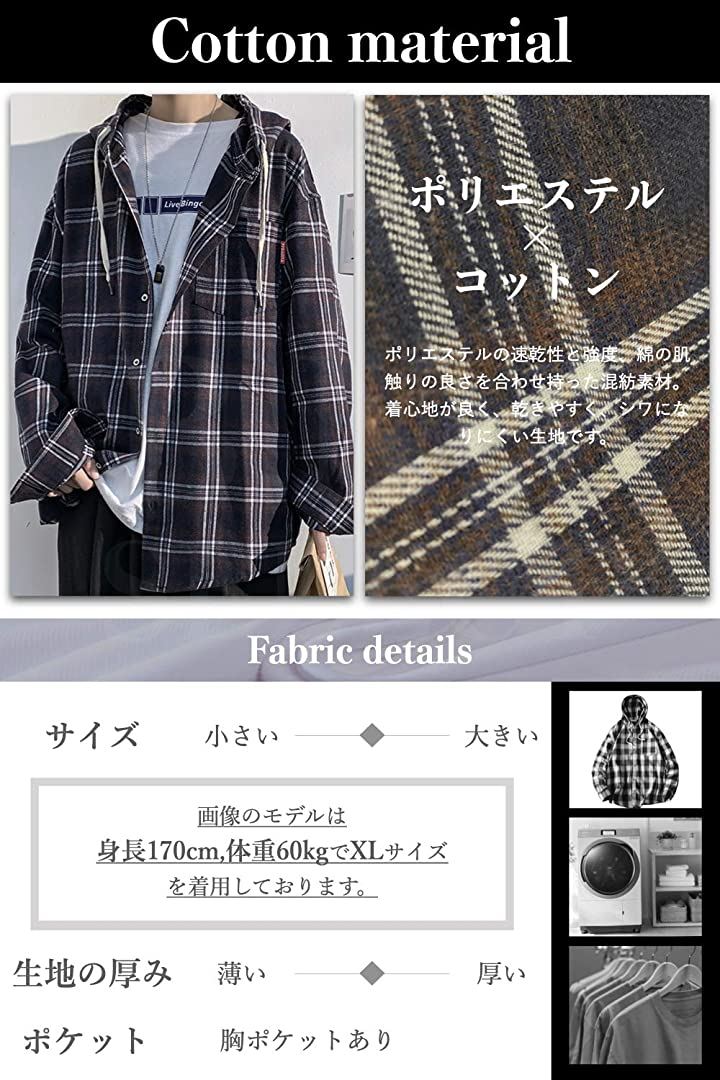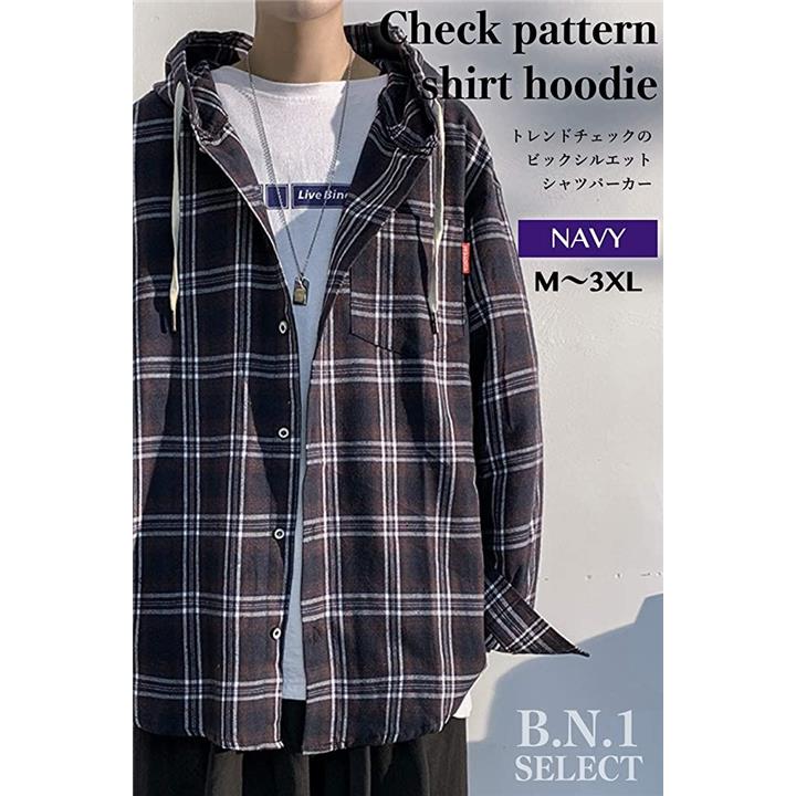 [ビーエヌワン セレクト] チェック パターン シャツ パーカー ビックシルエット ストリート カジュアル 長袖 トップス ジャケット ネルシャツ 上着 羽織 フーディー フード アウター オシャレ アメカジ かっこいい かわいい ゆったり 紳士 男性 春 秋 冬 秋冬 服 大人 ファッション 20代 30代 大きいサイズ 韓国 オーバーサイズ 紺 ネイビー BN73 NVY L |