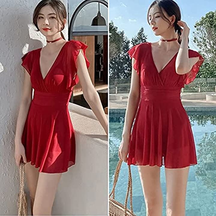 [アイラカリラ] アンリエ ワンピース 水着 Vカット スカート フリル シースルー 単色 胸パッド 付き ビーチウエア スイムウエア レディース (レッド, M) |
