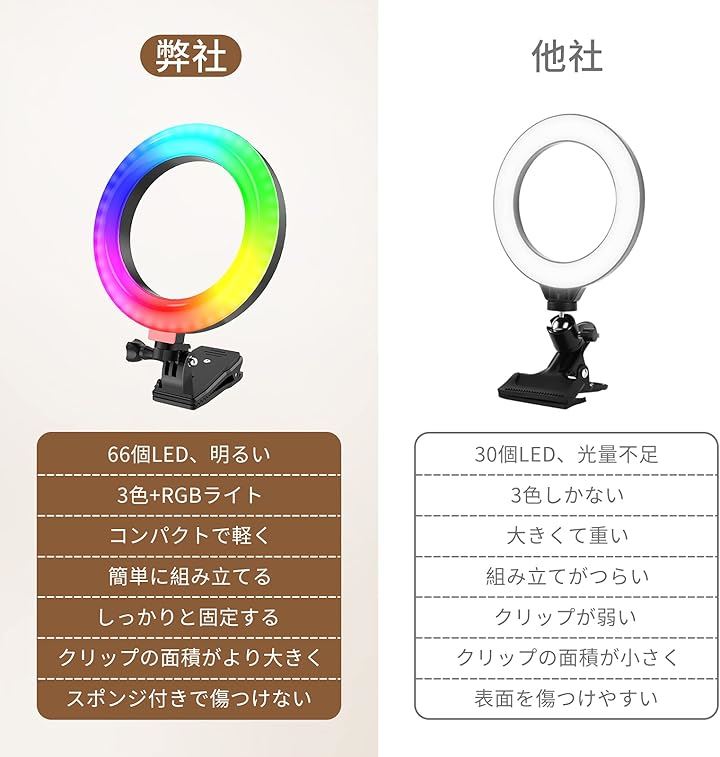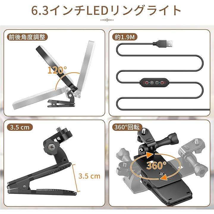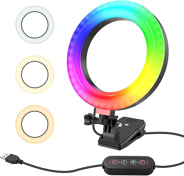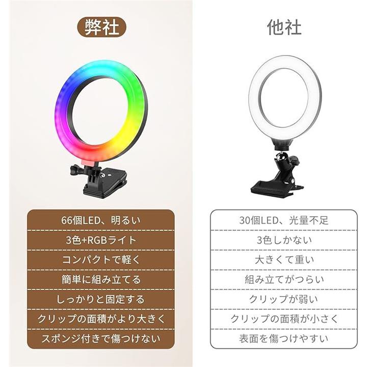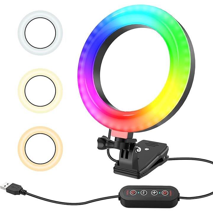 LEDリングライト RGBリングライト 6.3インチ 卓上・クリップ両用 USB給電式 3色モード RGBモード 明るさ調整 自撮りライト 撮影照明用ライト |