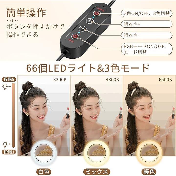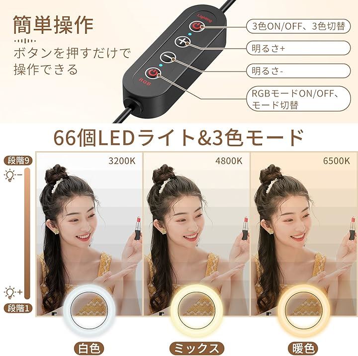 ・「高品質・目に優しいリングライト」基本的な3色照明モード(白色/暖色/混合光色)だけでなく、RGB色照明モード、各色温度も提供するこちらのLEDリングライトは、高品質RGBのLED素子を採用し、必要に応じて明るさを調整できます。