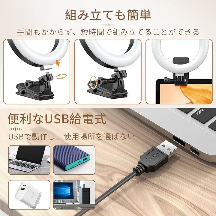 ・「USB給電サポート」ノートパソコン、モバイルバッテリーやUSB充電器等様々なUSBポートに差し込めば給電できるので、非常に取り扱いやすいLEDリングライトです。