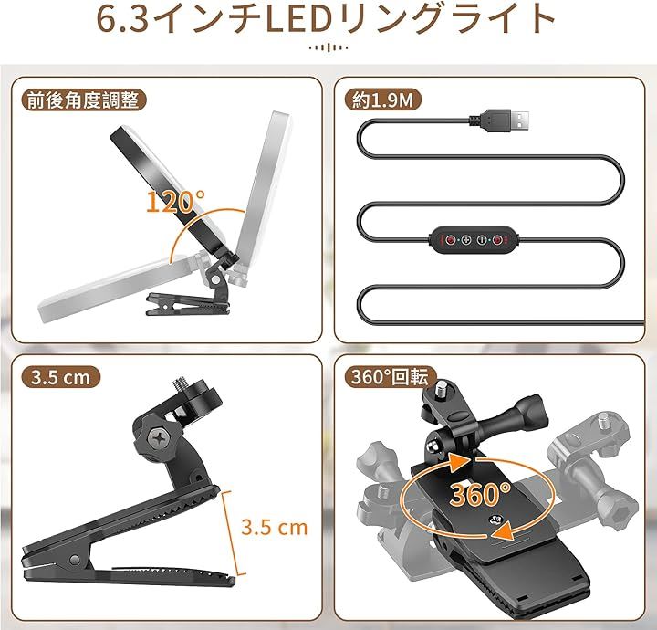 外径6.3インチのリングライトであり、10Wの省エネかつ高輝度の66個のLEDビーズを採用しており、光がまんべんなく照射され、200~6000ルーメンで明るく照らせます。