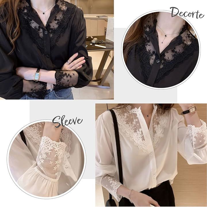 スリーブとデコルテラインに上品なレースが施されたエレガントなブラウス。