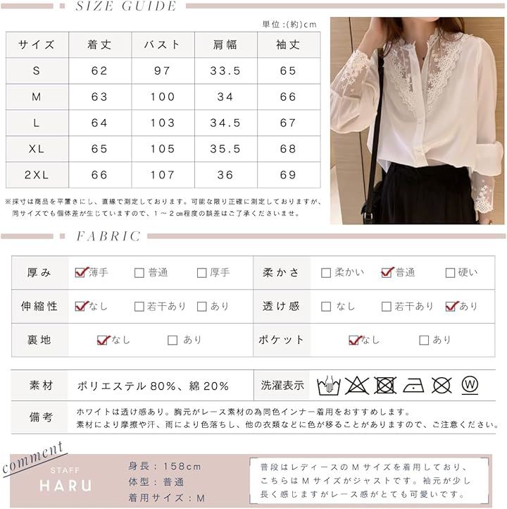 「Size」着丈/バスト/肩幅/袖丈 「S」 62/97/33.5/65 「M」 63/100/34/66 「L」 64/103/34.5/67 「XL」 65/105/35.5/68 「2XL」 66/107/36/69 *採寸は平置きにし、直線で測定しております。