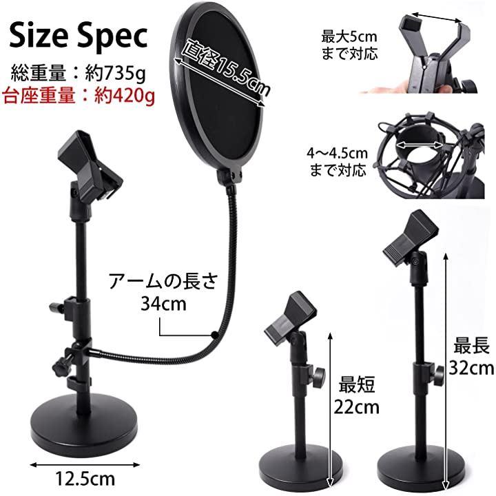 「サイズスペック」*卓上マイクスタンド台座長さ 12.5cm、ポール高さ22c-32cmアーム長さ 34cm、台座重量 約420g、総重量 約735g*マイクスタンドクリップ最大5cmまで対応*ポップガード 直径15.5cm*ショックマウント 幅4cm-4.5cmまで対応..