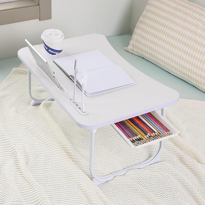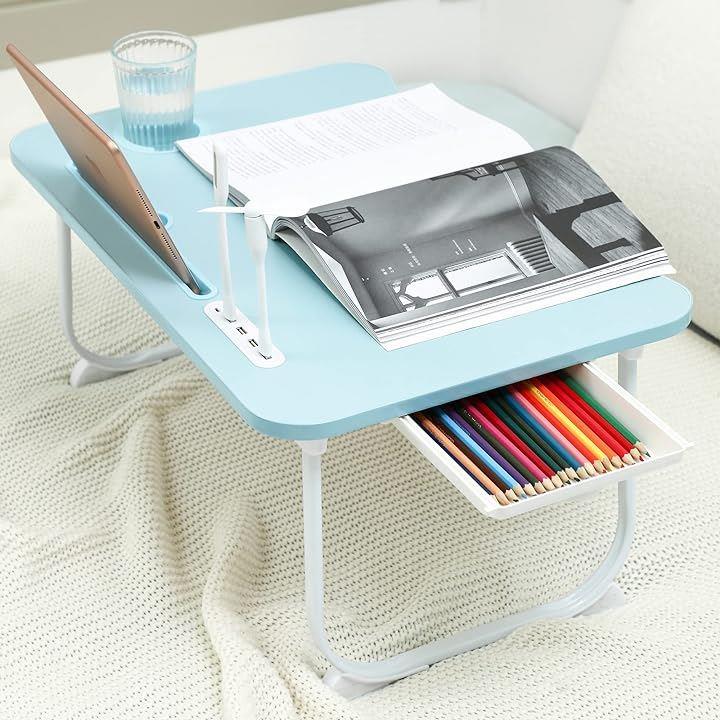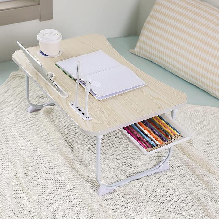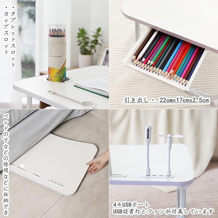 「多機能折りたたみテーブル」USB読書灯とファンが付属しています、折りたたみテ ーブルには、4*USBポート・タブレットスロット(最長辺の22CMを超えないタブレットに適用)があって、ラップトップ やスマホやタブレットに充電するのが便利です。