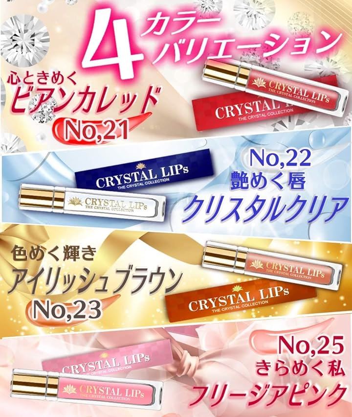 「 唇に嬉しい成分をたっぷり配合 」 クリスタルリップはぷるぷるした唇へ導くためにペプチド(パルミトイルテトラペプチド-7)・ヒアルロン酸Na・水溶性コラーゲンをしっかり配合しました(3種共に保湿目的)。
