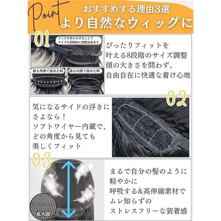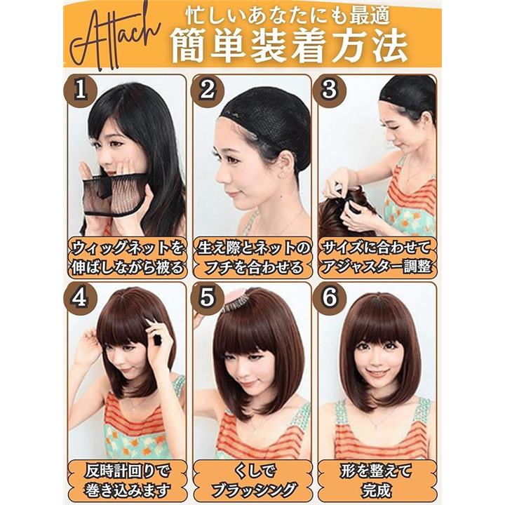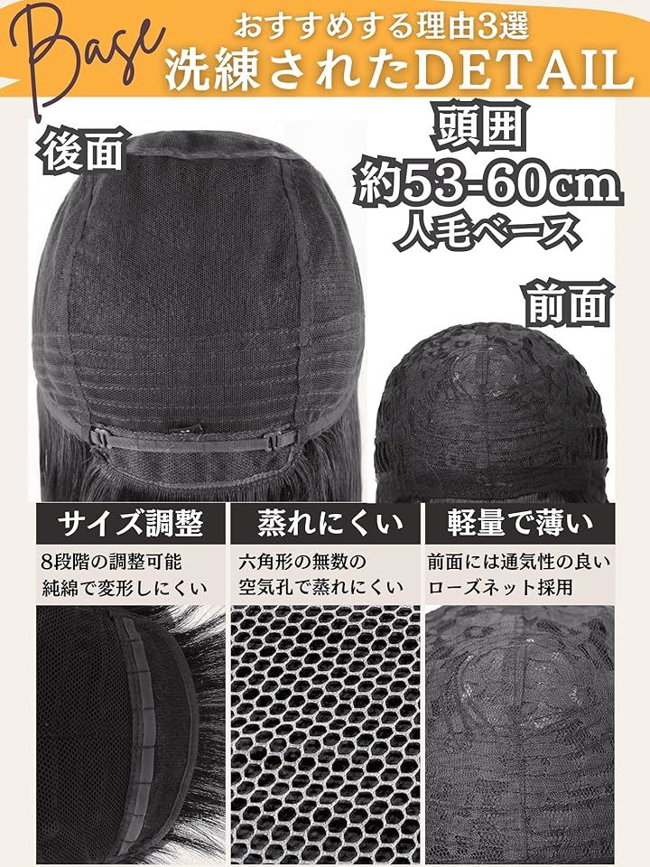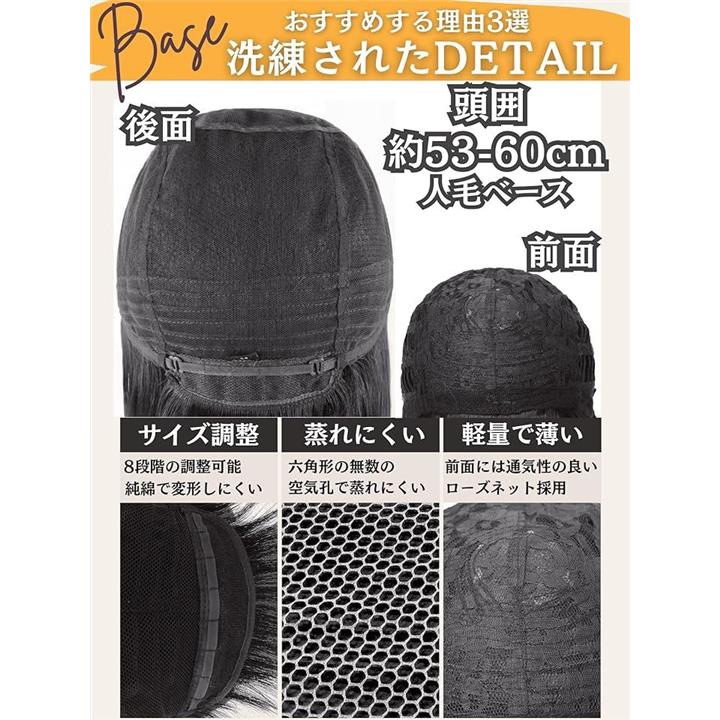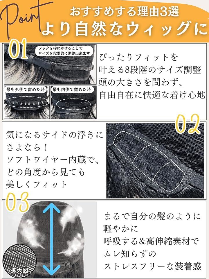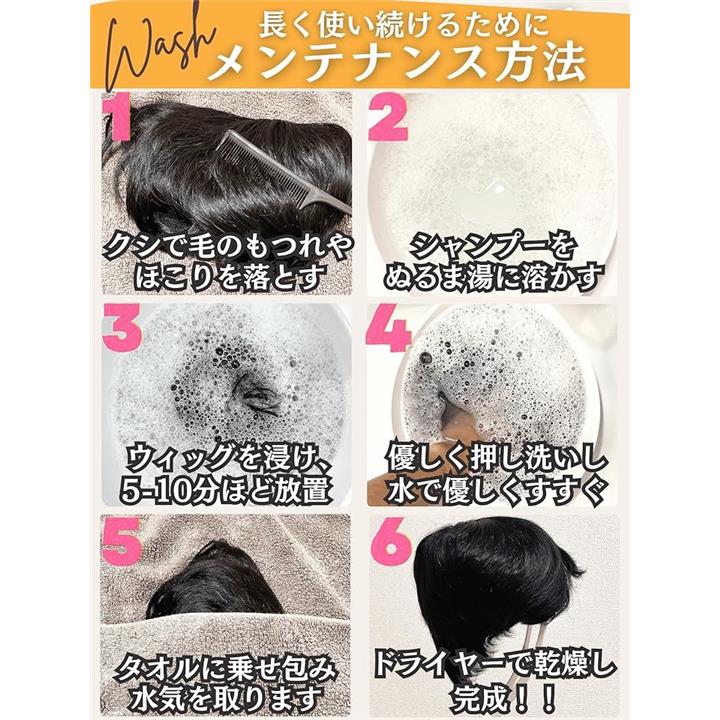 付属品:フルウィッグ、ウィッグネット、くし、専用ケース、折り畳みウィッグ置き、日本語取扱説明書 (A. メンテナンス法、B. 髪の癖の取り方、C. 装着方法 D. おすすめのヘアケア食べ物、E. おすすめのサプリメント)