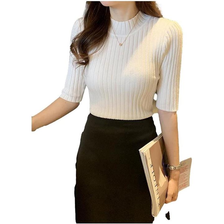五分袖 リブニット ニットソー ハイネック セーター レディース おしゃれ ファッション スリム クラシック スタイル トップス ボディライン フェミニン セクシー きれいめ 美 シルエット モックネック カジュアル 細見え