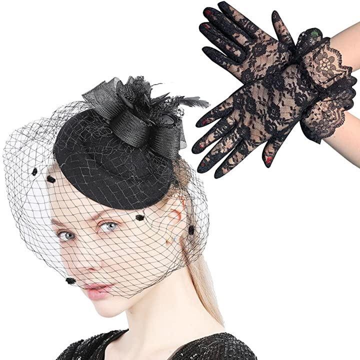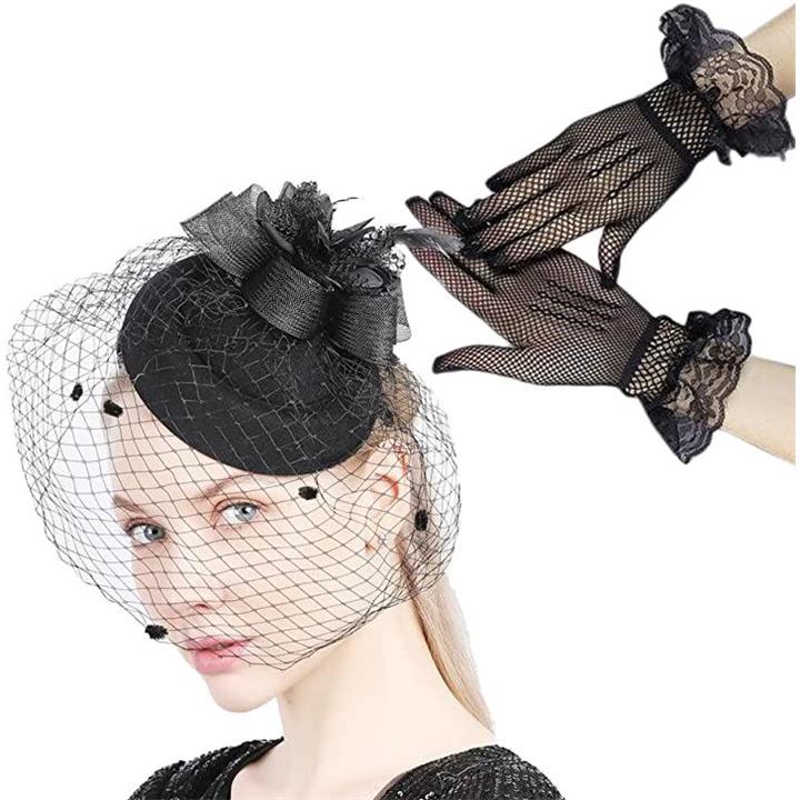 [ルクシア フィル] カクテル ハット 帽子 トーク帽 ブライダル ウェディング レディース ヘッドドレス ヘアアクセサリー 髪飾り レース手袋 セット(ブラック,Aタイプ) |