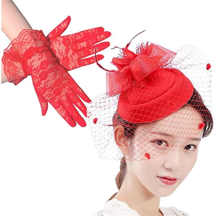 [ルクシア フィル] カクテル ハット 帽子 トーク帽 ブライダル ウェディング レディース ヘッドドレス ヘアアクセサリー 髪飾り レース手袋 セット(レッド,Aタイプ) |