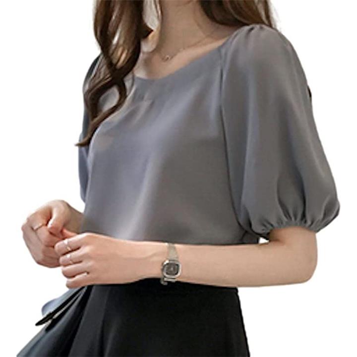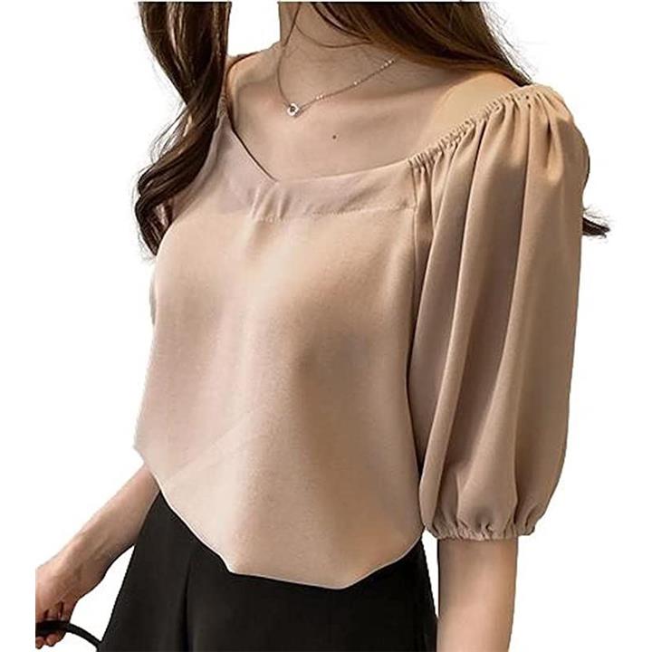 「自然なパフスリーブで二の腕カバー」五分袖のふんわりと広がったパフスリーブで二の腕をしっかりカバーしてくれるので、二の腕のラインが気になる方でも安心して着られるブラウスです。