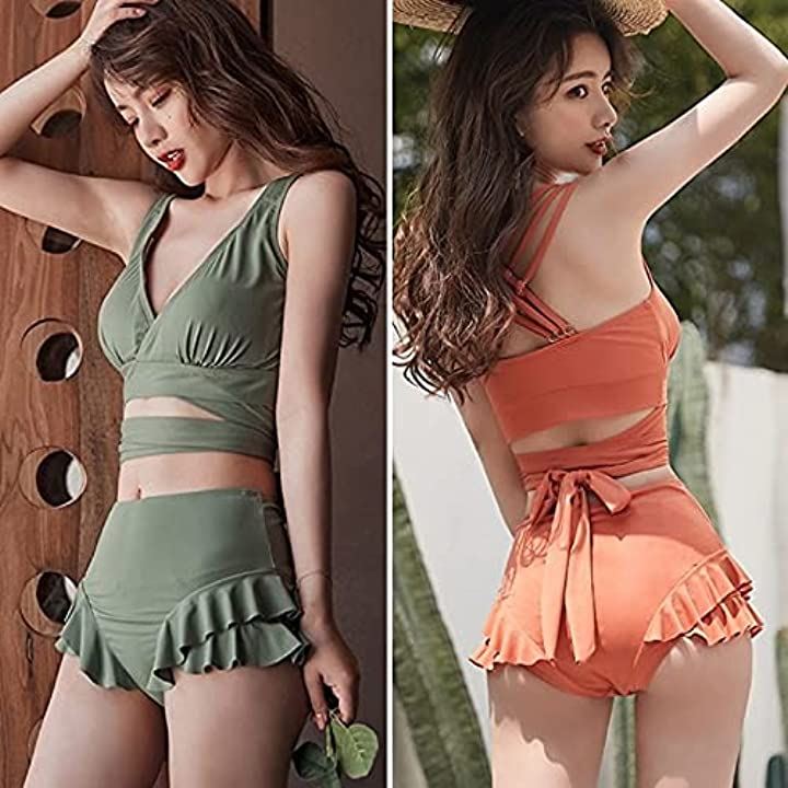 アイラカリラ フリル ビキニ 水着 リボン クロス カシュクール フレア セパレート くすみカラー 胸パッド 付き ビーチウエア スイムウエア レディース グリーン L