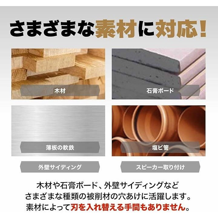 「用途」石膏ボード・プラスチック・木材・合板・薄鉄板・薄ステンレス板・薄アルミ板などの穴あけ作業に使われます。