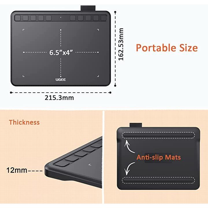 ・1.「S640ペンタブ仕様」UGEE S640ペンタブレットサイズ:約21.5x16.3cm;表示領域:6.5x4インチ;厚さ:1.2cm;重量:297g。
