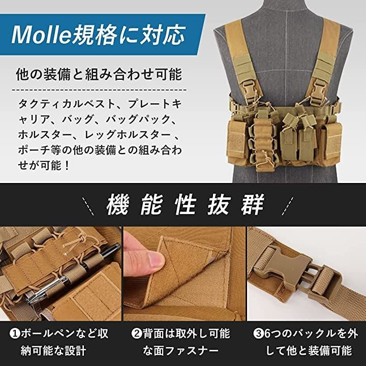 Molle規格に対応しているので、互換性のあるタクティカルベストプレートキャリアバッグバッグパックホルスターレッグホルスターポーチ等の他の装備との組み合わせが可能です。