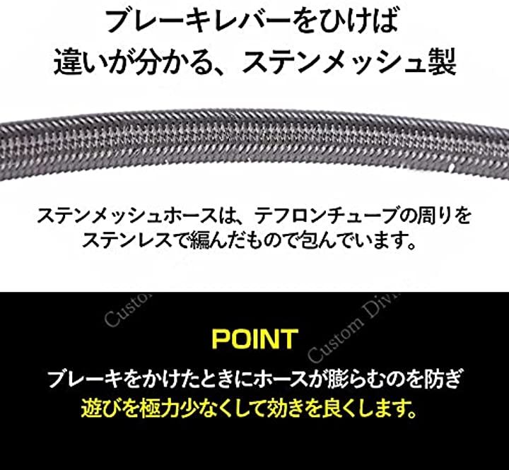 ノーマルで装着されているゴム製ホースは、ブレーキをかけると圧力がかかって内側から膨らみ、ブレーキの操作に悪影響を与えます。