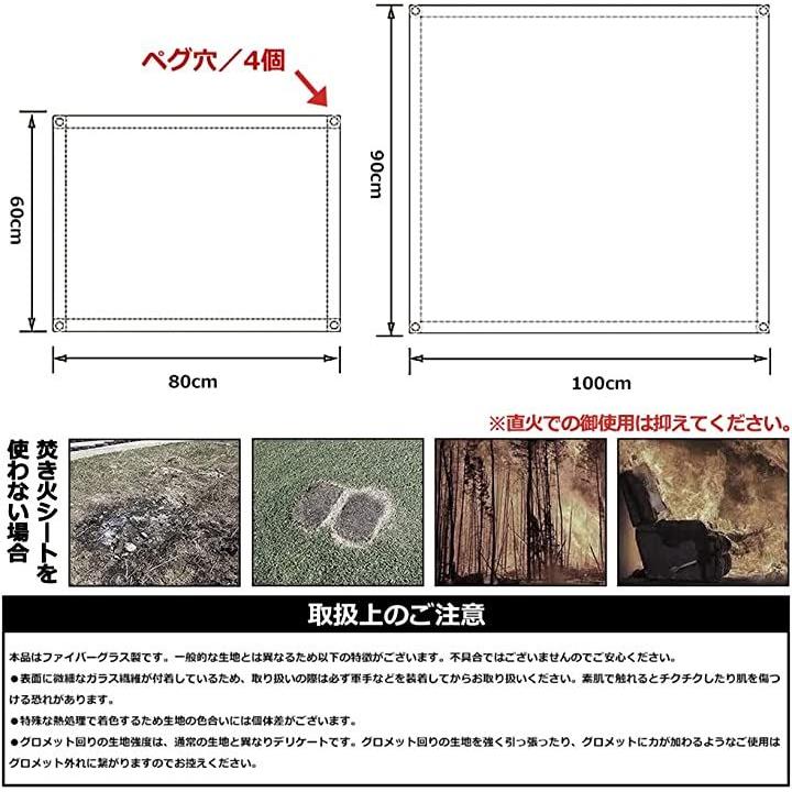・「スペック」サイズ/100x90cm 重さ/約450g 材質/ファイバーグラス ハトメ/あり お届け内容/焚き火シートx1,収納袋x1 *ペグは付属しません。