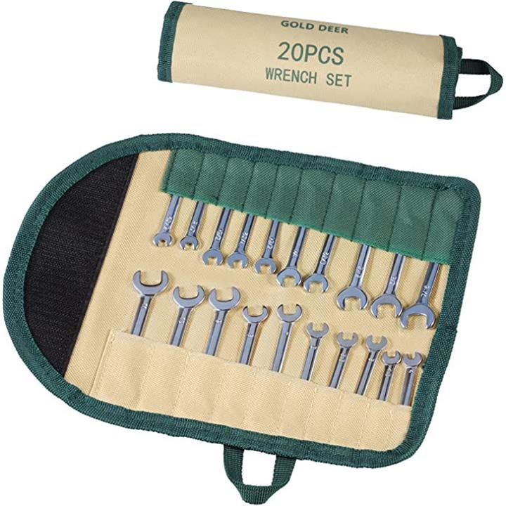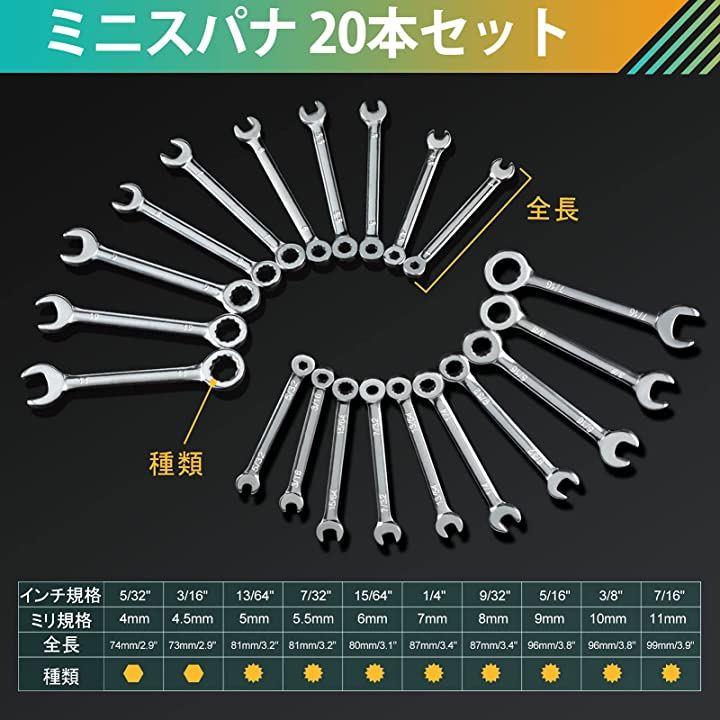 ミニスパナセット 20本組 薄型 片目片口スパナ 4-11mm 5/32-7/16 極薄 コンビネーションレンチ 薄口レンチセット 小型 めがねレンチ ミニスリムレンチセット ショート
