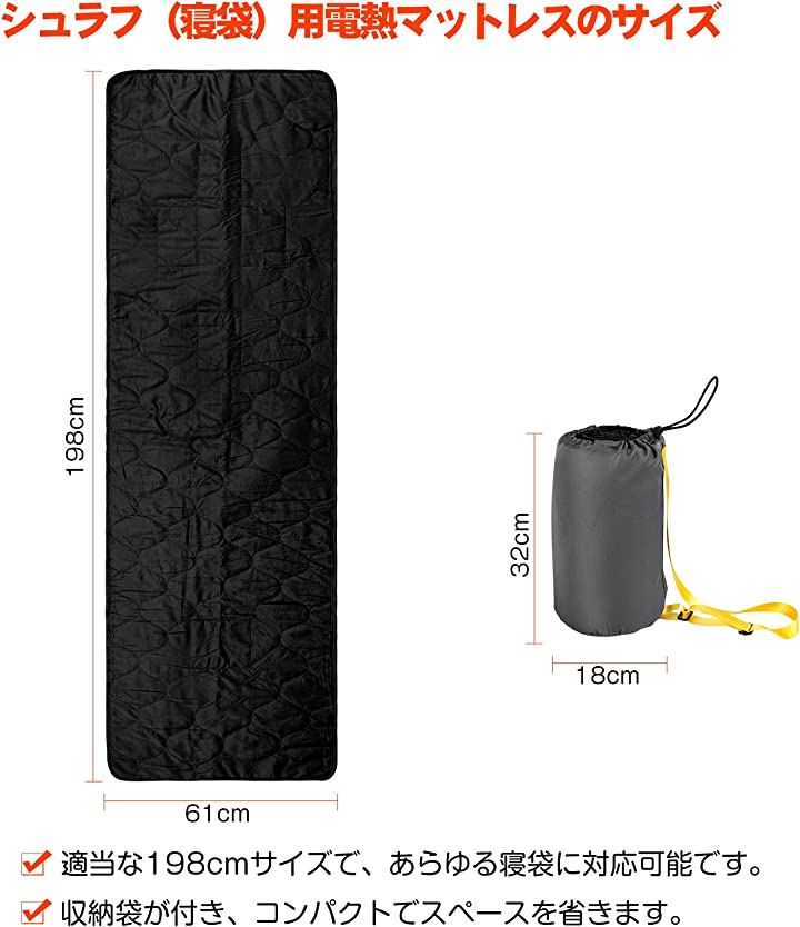 ・「様々な寝袋適用&柔らかい生地」「サーズ」約198cm x 61cm「重さ」約750g 表地:ポリエステル100%、中綿:ポリエステル100%、裏地:ポリエステル100% この電熱マットは適合のサーズで様々な寝袋に適用可能になります。