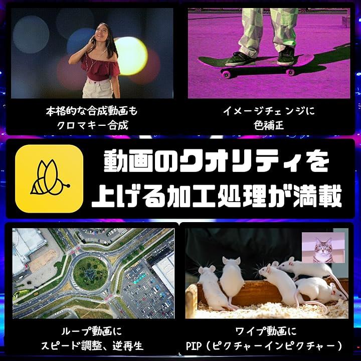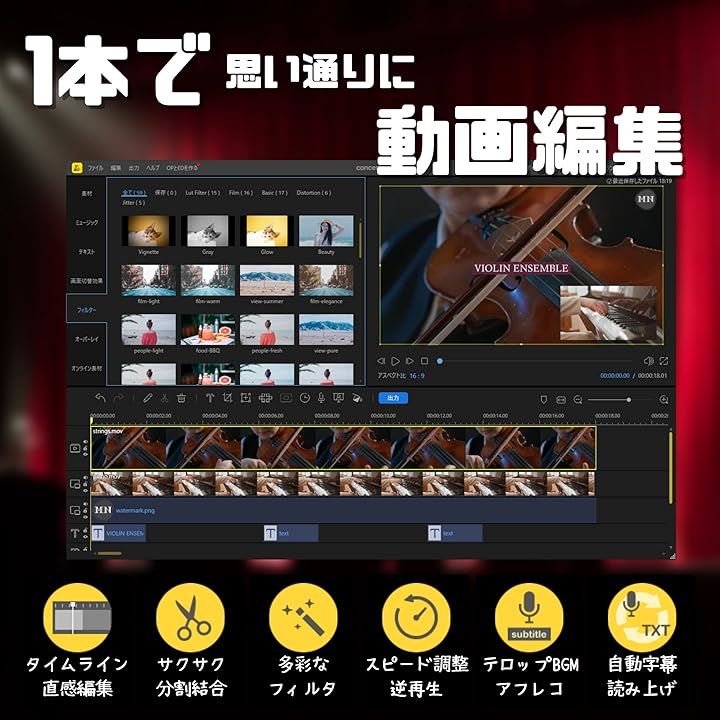 簡単な操作性で本格的な動画を作成することができるソフトですタイムラインを使った直感的かつ本格的な動画編集サクサクとマウスドラッグで動画を分割・結合多彩なフィルター、素材、トランジションを活用した演出スピード調整、逆再生を駆使してリズミカルにテロップやBGM、字幕の挿入、アフレコも直感的に字幕起こし、読み上げ、歌入楽曲から伴奏だけ抽出してカラオケ動画の作成もできる流行りのループ動画、逆再生、色補正、ワイプ動画(ピクチャーインピクチャー)、クロマキー合成、フォトムービー、モザイク加工、デスクトップ録画で動画マニュアル作成、GIFアニメ変換などプライベートからビジネス活用まで幅広くカバーします。