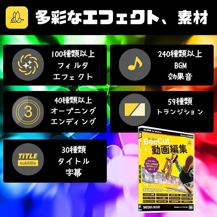「シンプルなのに本格的」初めての動画編集に最適魅力的な動画に仕上げる多彩なエフェクトを収録100種類以上のフィルターエフェクト、59種類のトランジション、30種類のタイトル・字幕、240種類以上のBGMや効果音、40種類以上のオープニングエンディング