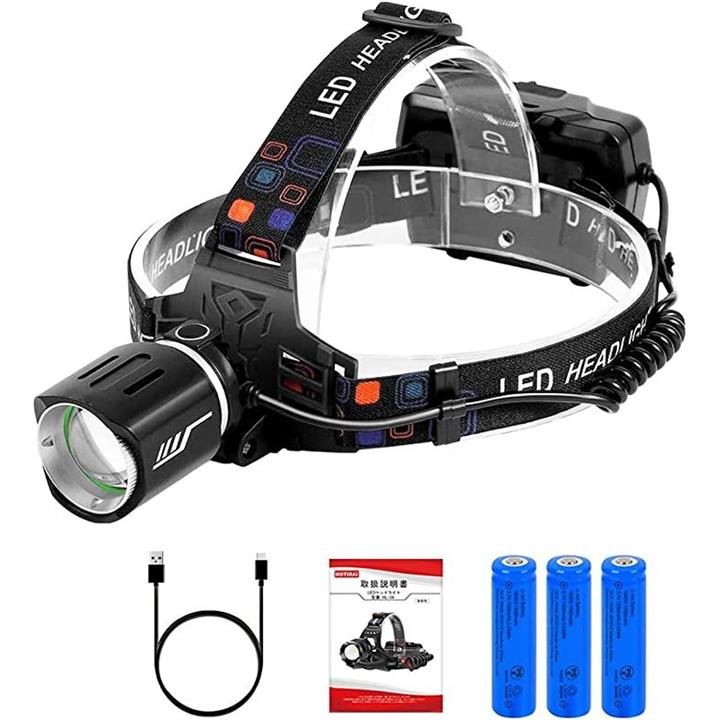 XHP70強力ヘッドライトx1、18650充電式バッテリーx3、Type-C充電ケーブルx1、日本語マニュアル