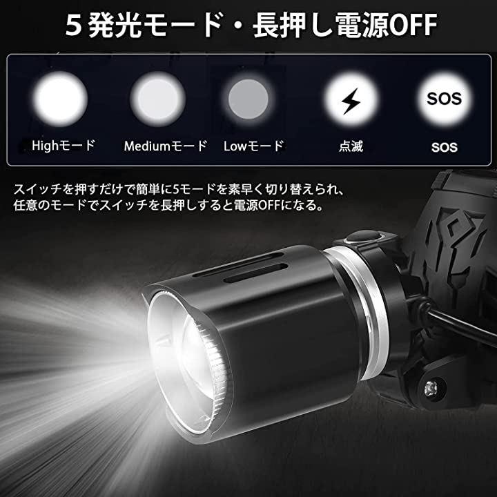 ・*「5モード調光ズーム式 & 2秒長押しで消灯」ヘッドライトはボタン1つで5モード(強光/中光/弱光/点滅/SOS)が調整可能です。任意のモードで2秒長押しで消灯できるので、ストレス無く快適にご使用いただけます。