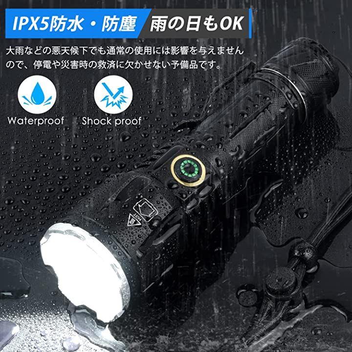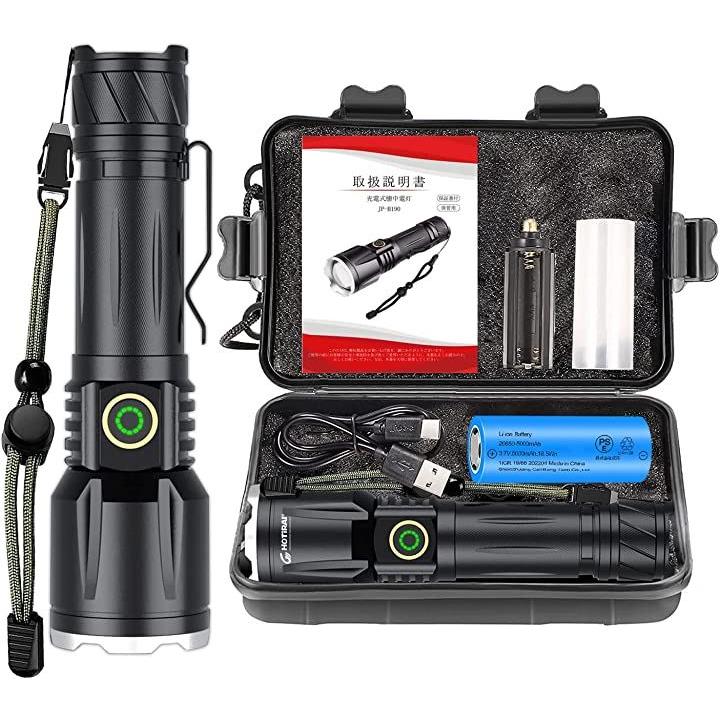 「商品仕様」光源LED:米国製XHP160本体材質:アルミニウム合金充電時間:約5時間点灯時間:約8~30時間(付属のバッテリーの場合)防水規格:IPX5重さ:懐中電灯本体約190g、付属の電池約90gサイズ(約):長さ17CMxヘッド部分直径4.8CMxハンドル直径3.4CM「パッケージ内容」XHP160LED懐中電灯本体x1、26650充電池x1、Type-CUSBケーブルx1、18650電池用ホルダーx1、単4電池ホルダーx1、吊りロープx1、日本語マニュアル