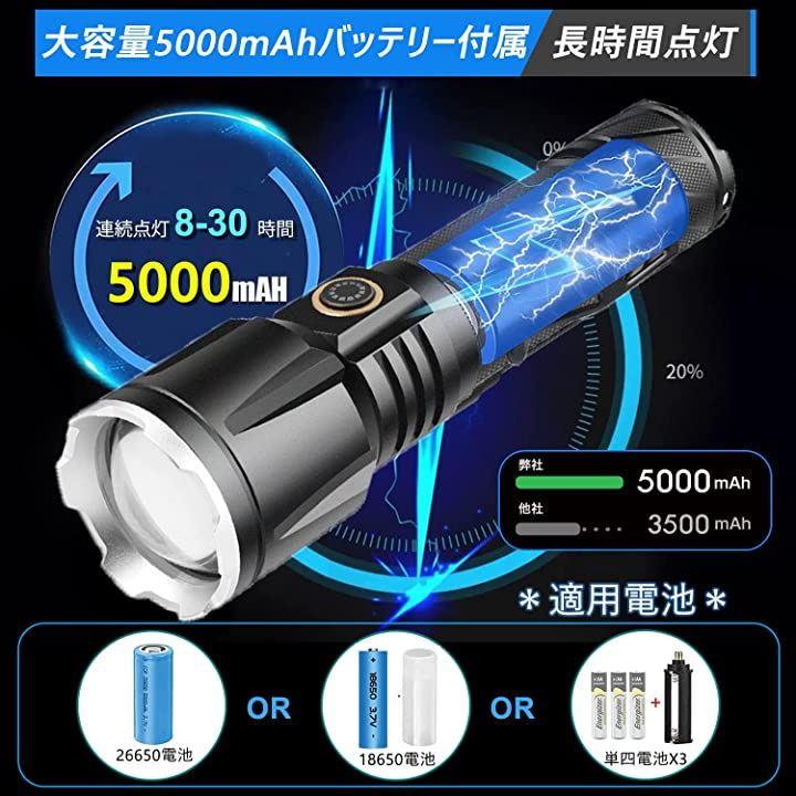 「大容量5000mAh電池付属」LED懐中電灯には大容量充電池を付属し、高輝度モードを使用した場合でも長時間点灯が可能です。