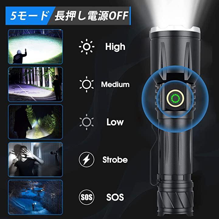 ・「5モード調光ズーム式 & 2秒長押しで消灯 」 LED懐中電灯は、操作が簡単で、片手操作でスイッチを押すだけで簡単に5モード(High>Medium>Low>フラッシュ>SOS)を素早く切り替えられ、用途に合わせてより多くな使用シーンに対応できます。