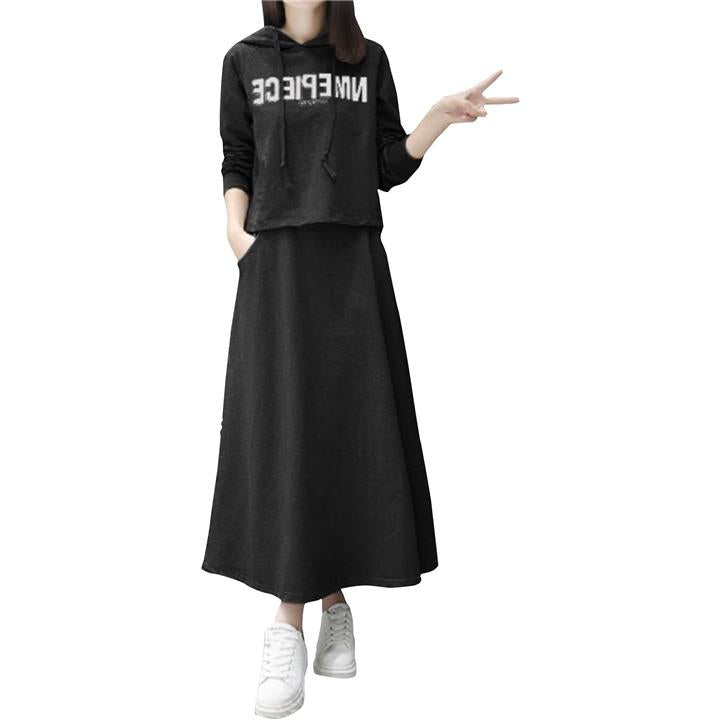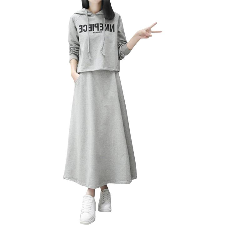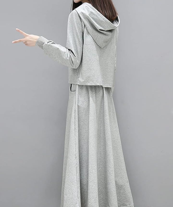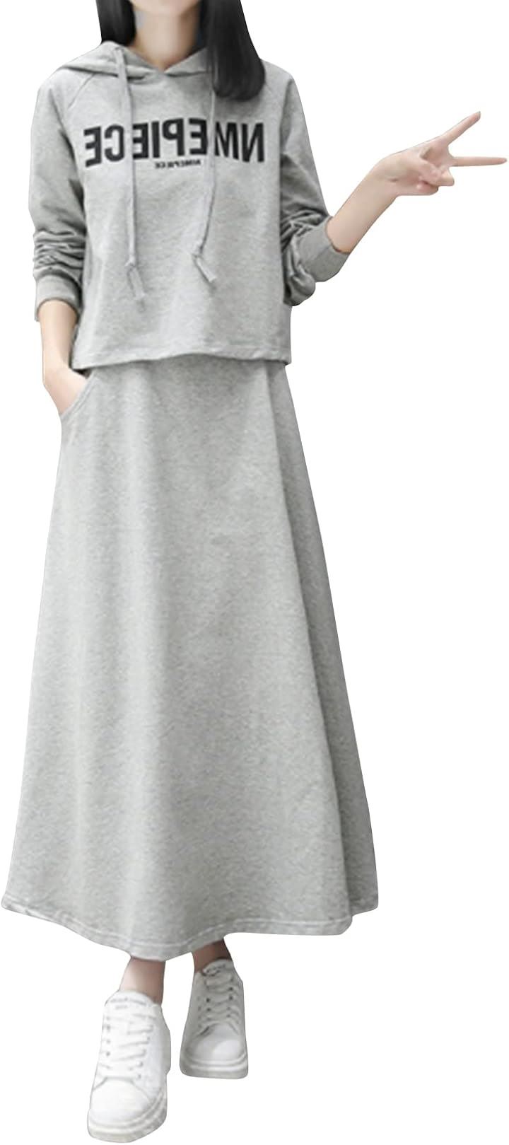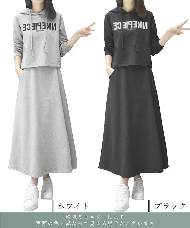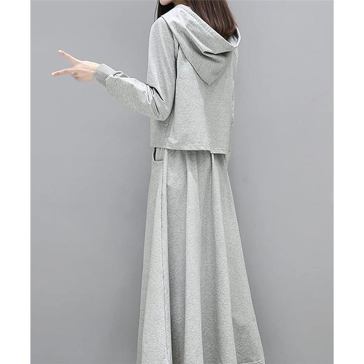 おうちでも外出先でも活躍するフード付きパーカーとフレアロングスカートのセットアイテム。